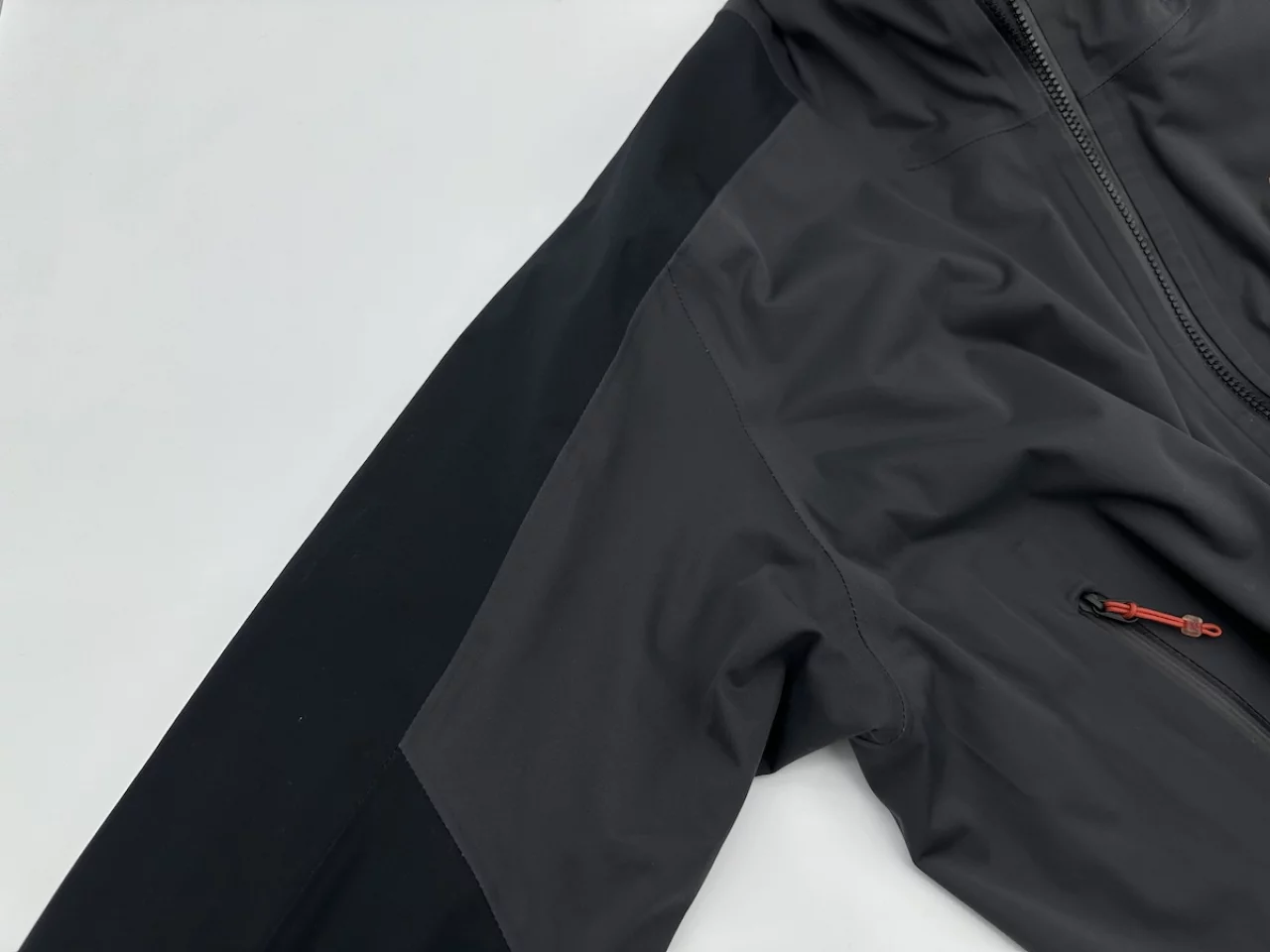 フード、肩、腕、腰のサイドには見た目からもわかるように、セラミックプリント補強が行われており、過酷でテクニカルな登山で起こりやすい、ザックや岩場との擦れに対しての摩耗や露出から保護します。触った感じもポリアミドウーブンによって滑りづらく、重量のあるザックを背負った時に摩擦によってぴったりとフィットするように感じます。