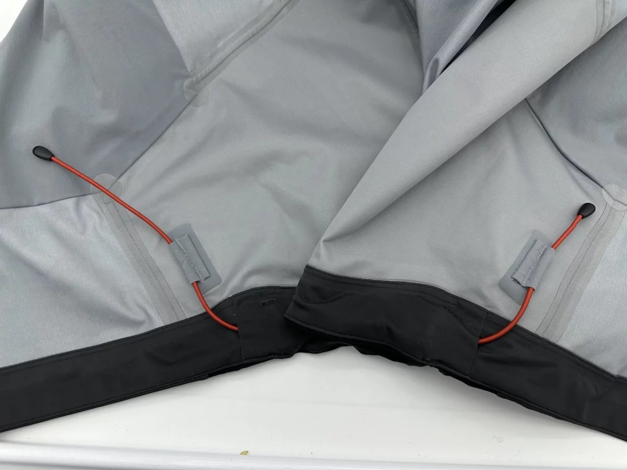 裾には左右に備えられたドローコードの先端を引っ張るだけでフィット調整を可能にし、裾からの冷気の侵入を防ぐとともに、ピタッと体にフィットさせ風のバタつきを抑えてくれます。