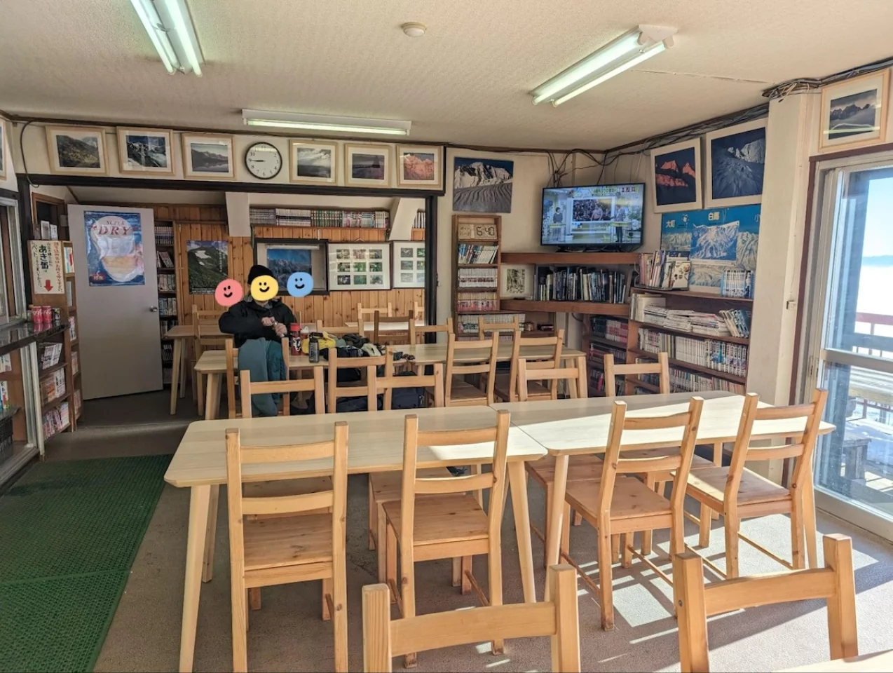 広々とした食堂。本や漫画や雑誌がたくさんあります。ここならソロで来たとしても暇を持て余すことはなさそうですね。館内は原則バーナー使用不可。※自炊される方は相談くださいとの事でした。