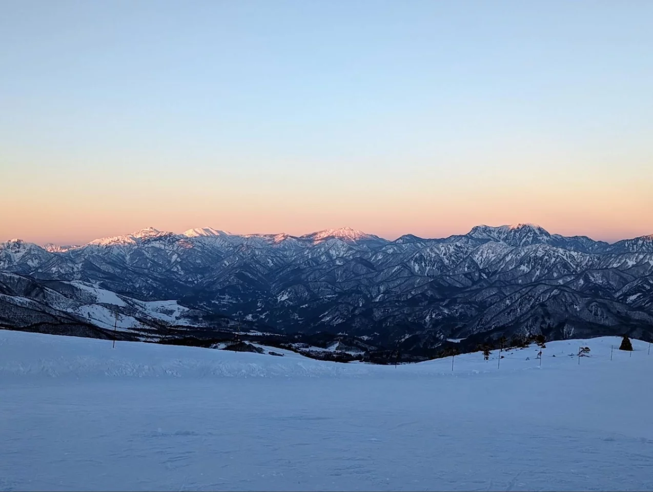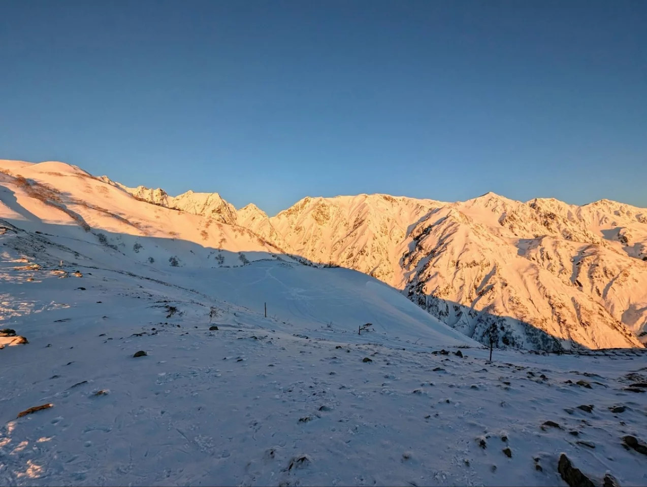 顔ケルンのところで朝日が登りました。後立山連邦の雪山モルゲンなんて、どれだけ経験を積めば見れるんだろうと思っていましたが、これも山荘に泊まったおかげです。