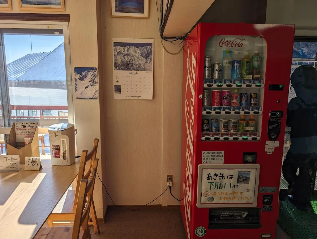 販売機ではペットボトルやビールもあり。他にもワインや日本酒、お菓子もありました。宿泊者は無料でお湯がいただけます。