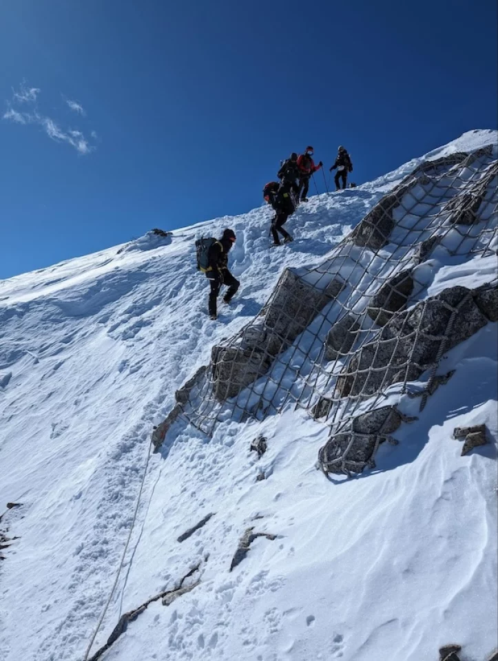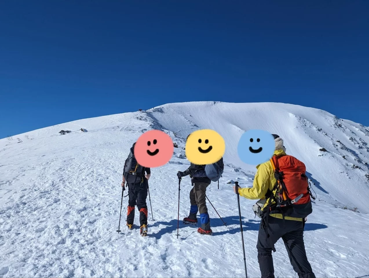 基本的に危険箇所は少ない登山道でしたが、山頂付近は急斜面や道幅が狭いところが出現します。すれ違いが難しいので譲り合って通過。アイゼンとピッケルを刺して足場をしっかりと確認しながら進んでいきます。