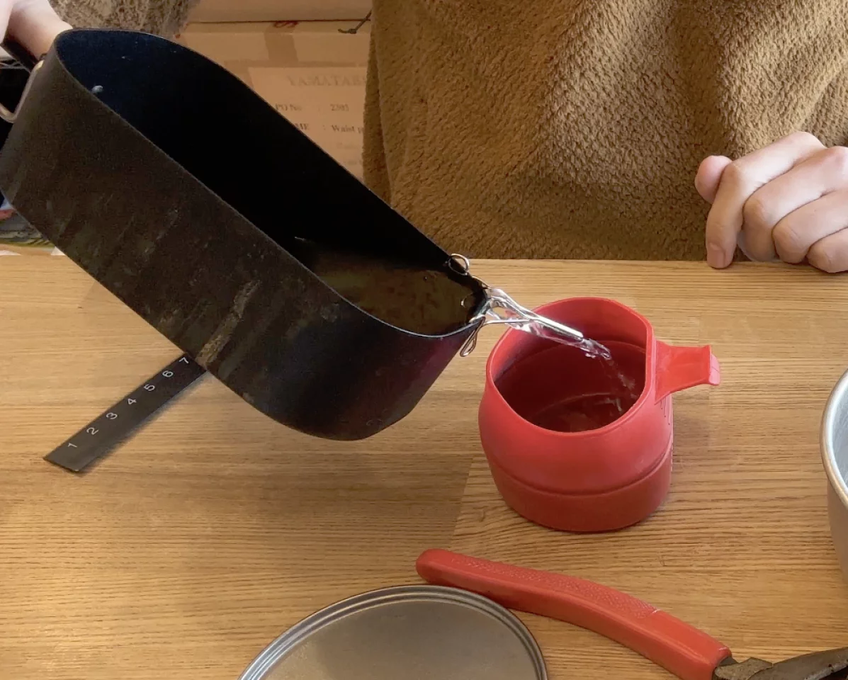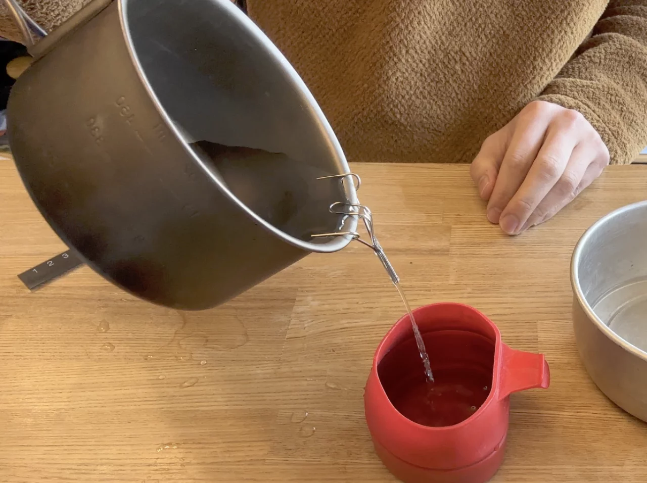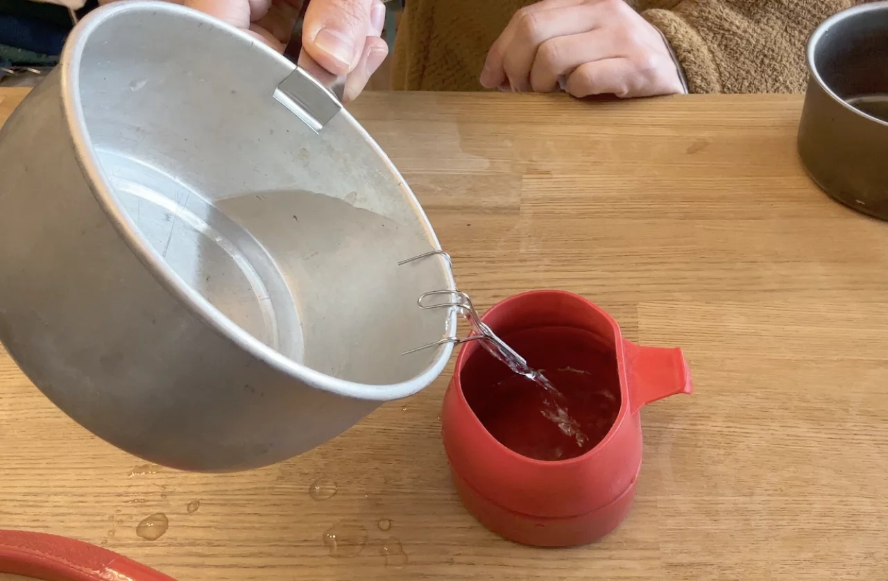 このソースパンで細いお湯を作るのは、少し難しく感じるので、ワイヤースキッターがあると便利だと思います。このソースパンでお味噌汁を作って仲間のお椀に分ける時、過去こぼしてしまったこともあったのですが、そういったシーンで便利に使えるなと感じます。