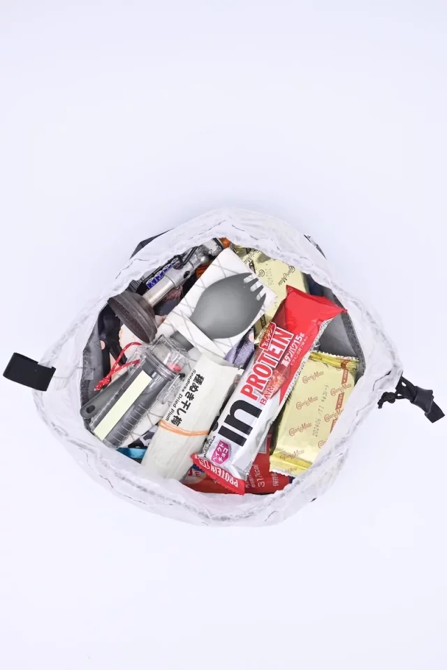 ボトム部分に耐久性と張りがあるX-PACVX07を使用し自立をするスタッフバッグです。中に入れたものを包み込む素材には、柔らかく耐久性を備え、さらに軽量で透明なので中のものを視認しやすいダイニーマを使用しています。