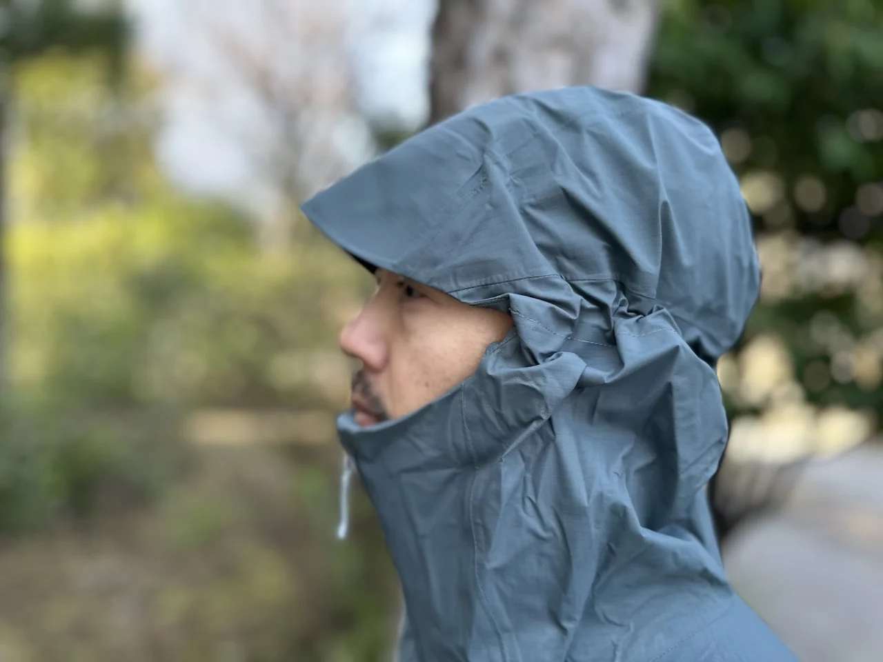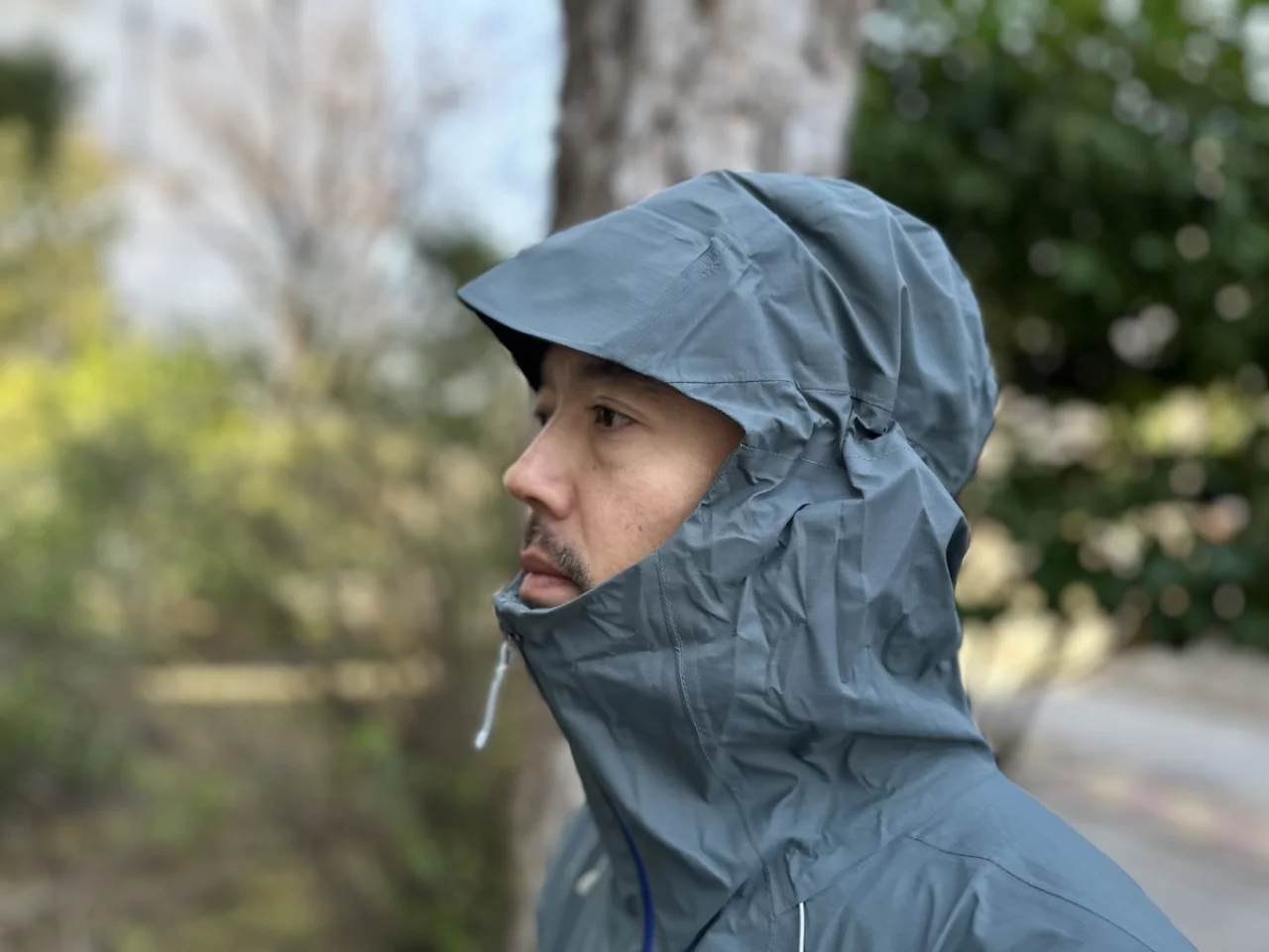 僕は身長180cm弱、体重65kgで、着用しているのはSサイズです。トレントシェル3L・レイン・ジャケットはSサイズだと少しタイトに感じたのですが、グラナイト・クレスト・レイン・ジャケットの場合はちょうど良いという印象があります。
