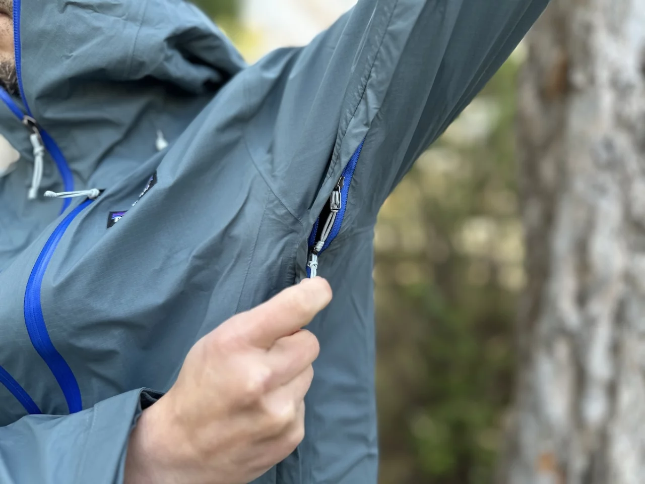 またピットジップはダブルジッパーなので、開口部分の調整を容易に行うことができます。ピットジップのサイズは結構大きく、上は肘から15cm離れたあたりまで、下は脇腹あたりまであり、涼しい風を取り入れるのが容易です。僕はこのペットジップを利用して夏場はピットジップに腕を通してレインジャケットをレインベストのように使っています。非常に涼しくて発汗を抑えることができます。