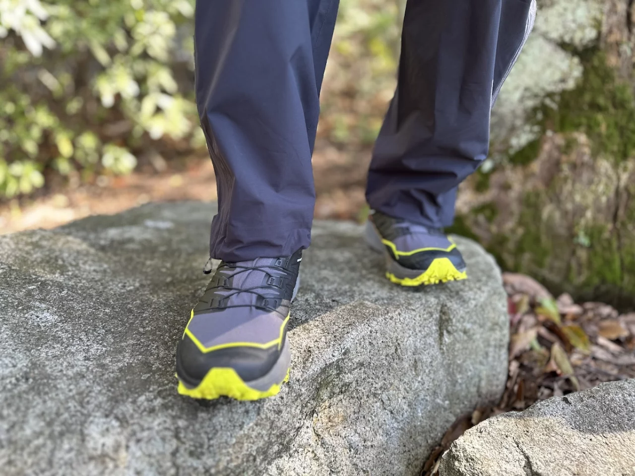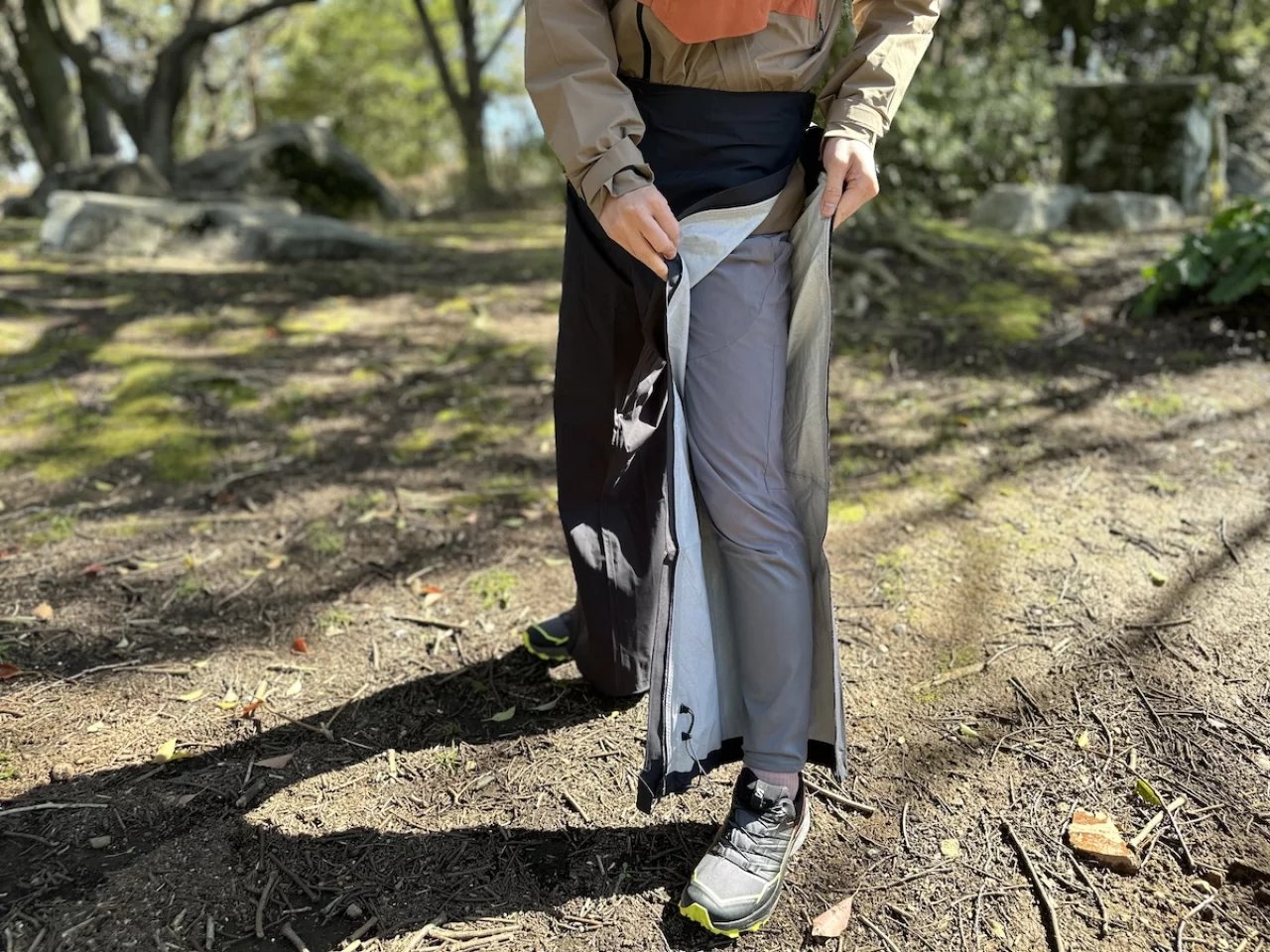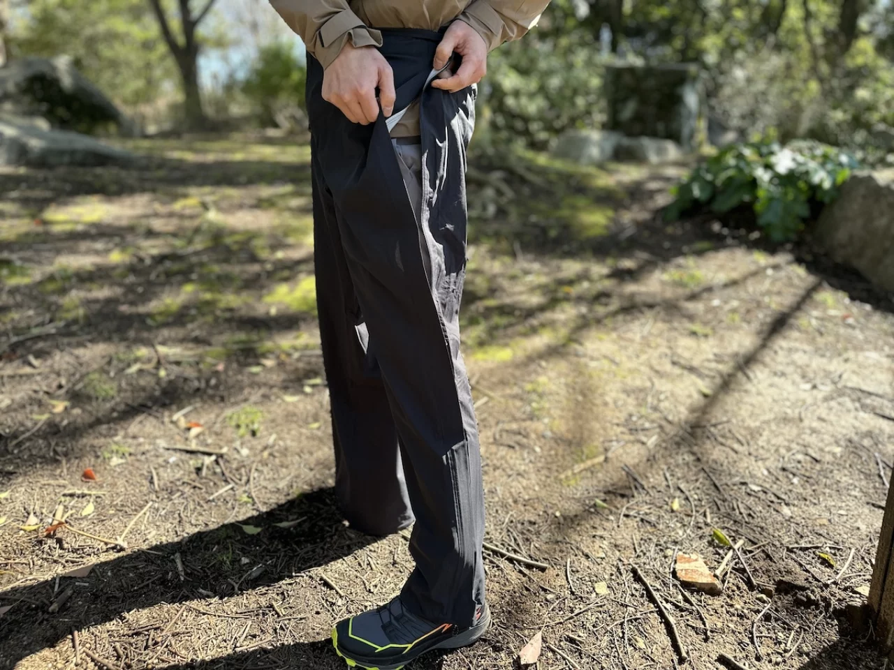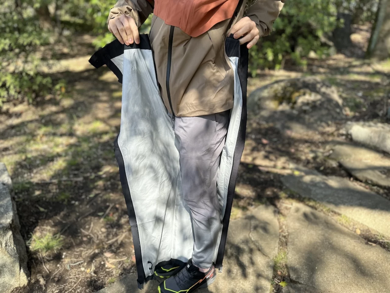 だからレインパンツを着用する時は登山靴を脱ぎ履きする必要がなく、またパンツに足を通す必要がないので、レインパンツが登山口の泥で汚れることもありません。トレイルランニングのようなシューズでも、ハイカットやミドルカットなどの登山靴でも気にすることなく脱ぎ履きが可能なレインパンツです。
