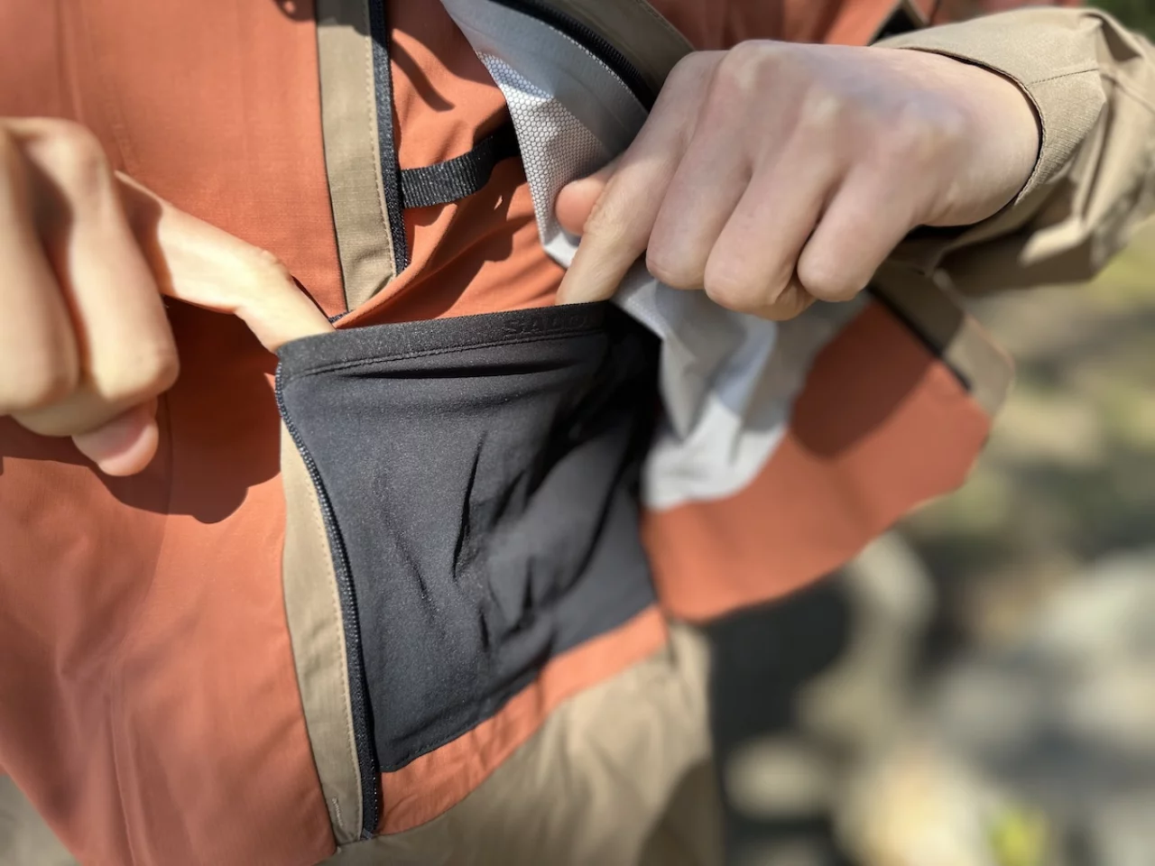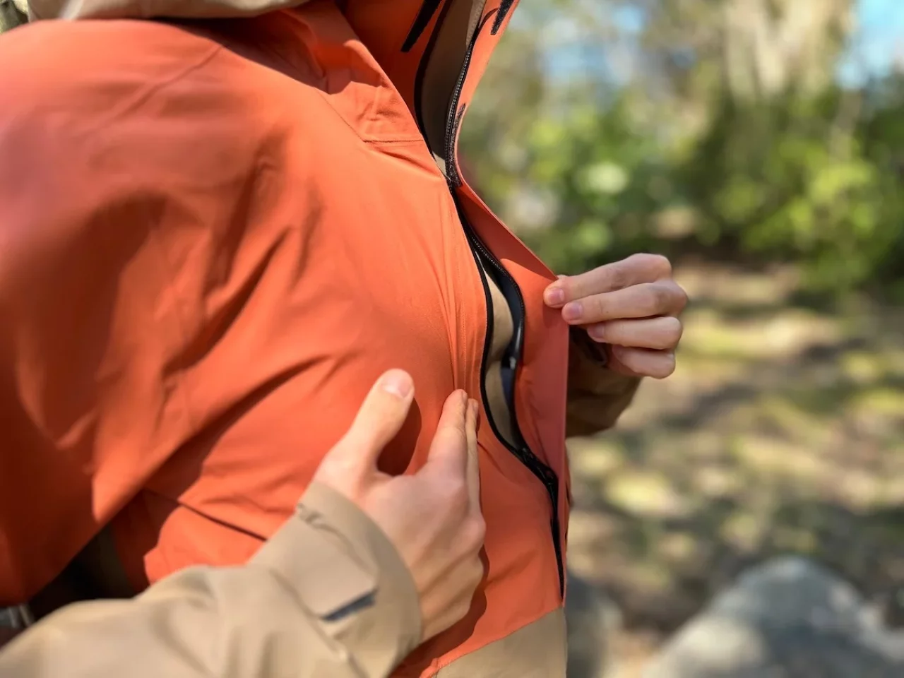 フロントジッパーはダブルジッパーで止水ファスナーです。雨が降った状態でフロントジッパーからの通気を確保したい時に、フロントジッパーをお腹の上あたりまで下げて、色が変わっているジャケット上部にはベルクロテープが備わっているのでこのテープを閉めてあげれば隙間から通気を確保することができます。