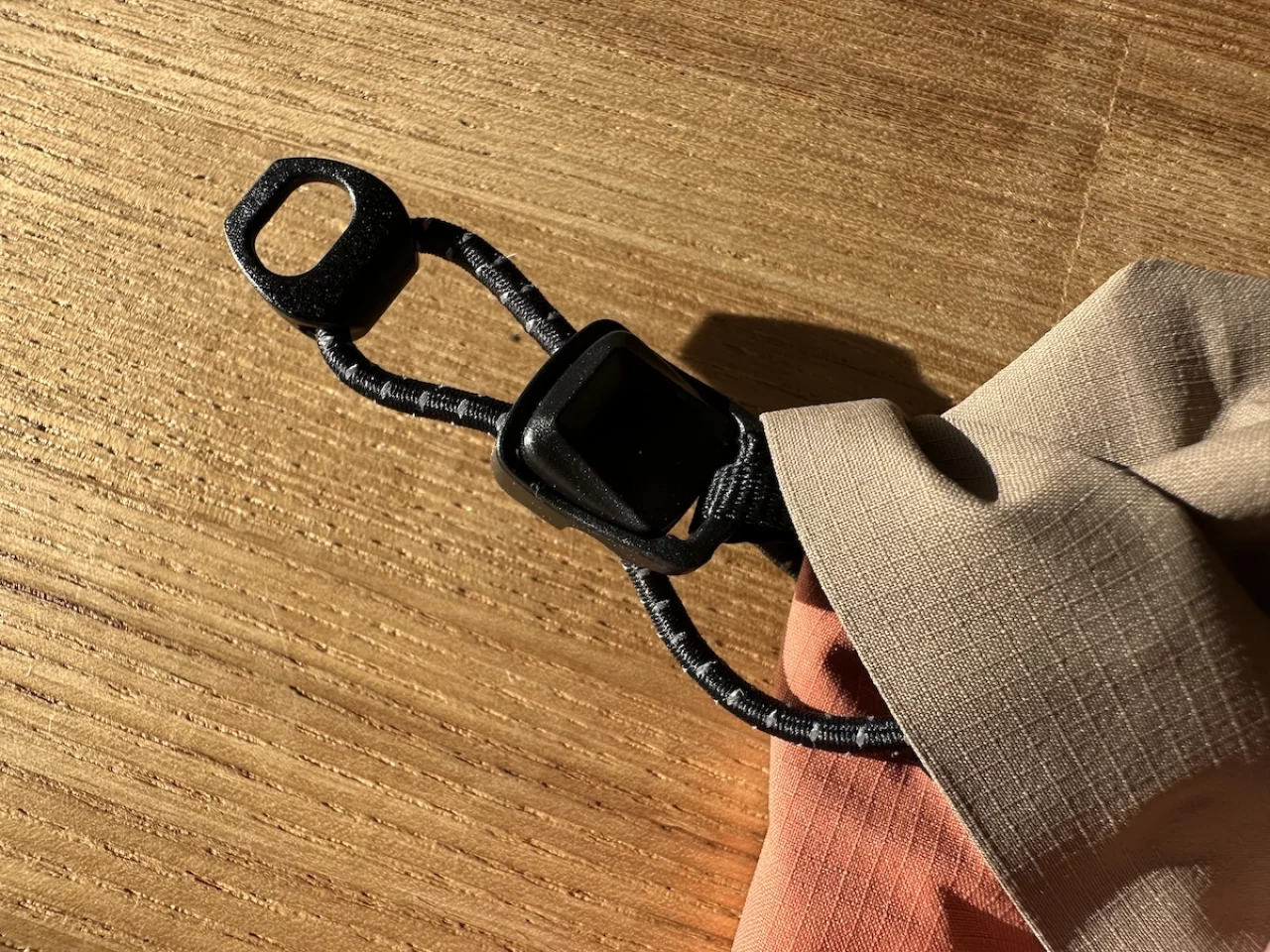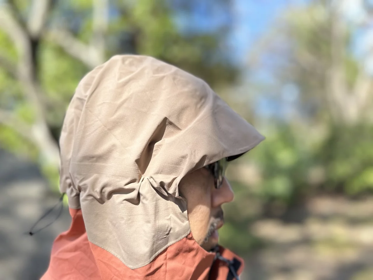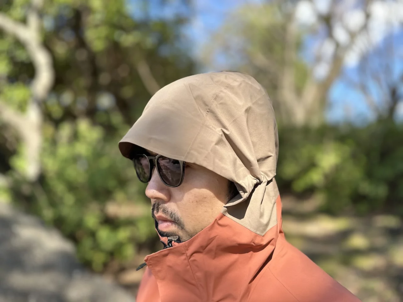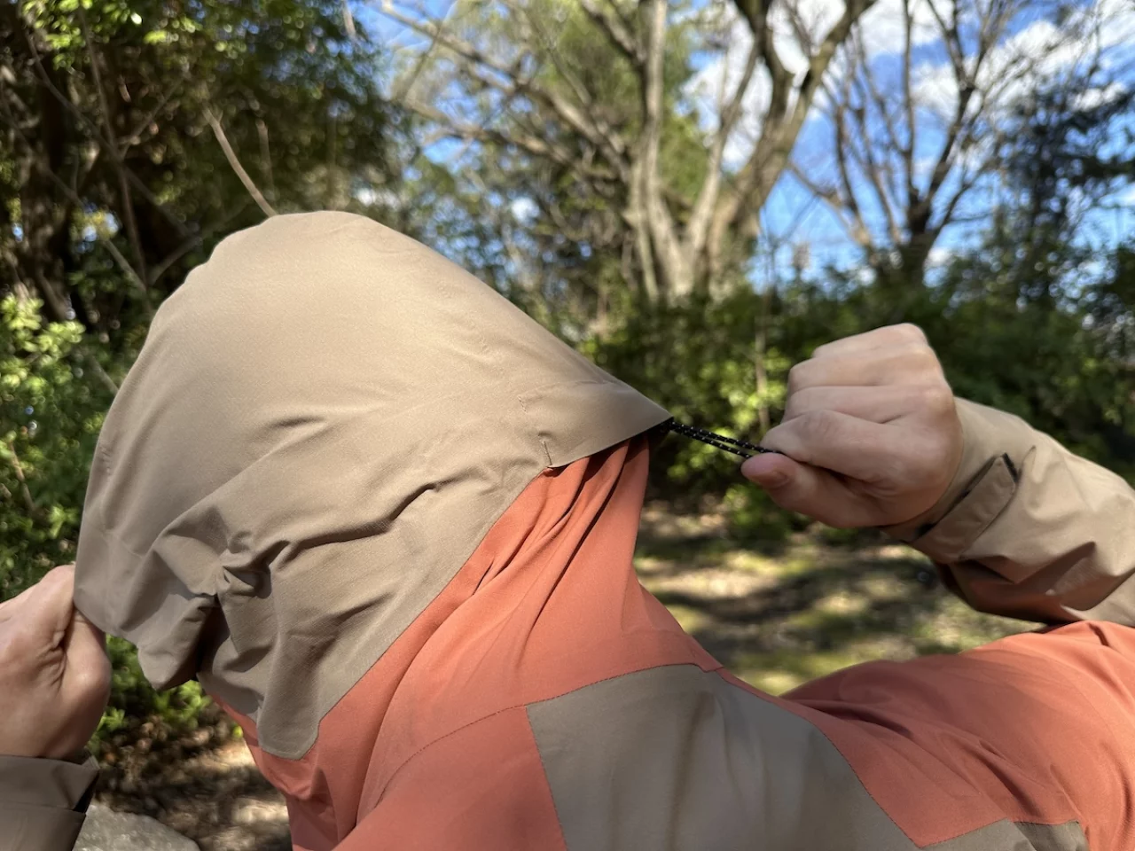 もう1つすごいのが採用しているコードロックと先端のプラスチックハードウェアです。見た目なんてことのないものなのですが、コードを引っ張るだけで素早くフィットさせることができ、緩めるのはコードロックのボタンを押すだけという、全て片手で完結させることができます。これは実際に雨の中を素早く行動してる時に、かなり使い心地が良くめちゃめちゃ気に入ってるポイントの一つです。