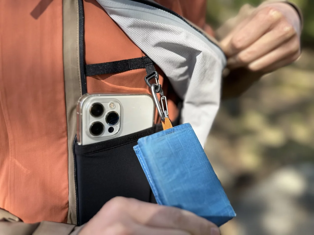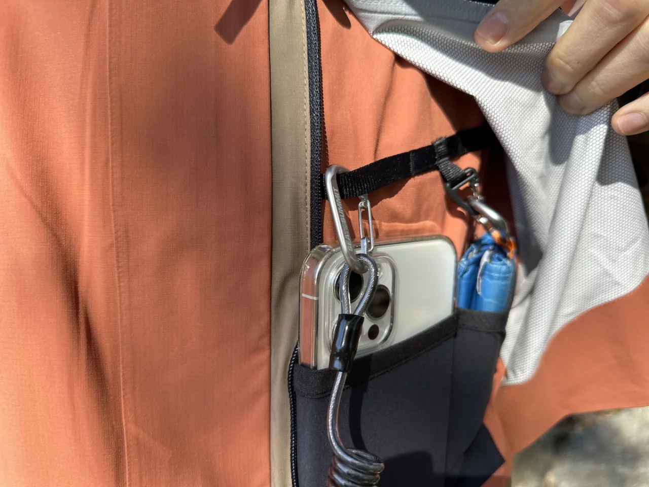 メッシュポケットはストレッチ性が高いのでスマートフォンを収納して固定しておくことが可能で、僕が持っているiPhone14Proを無理なくストレッチポケットの中に入れることができます。