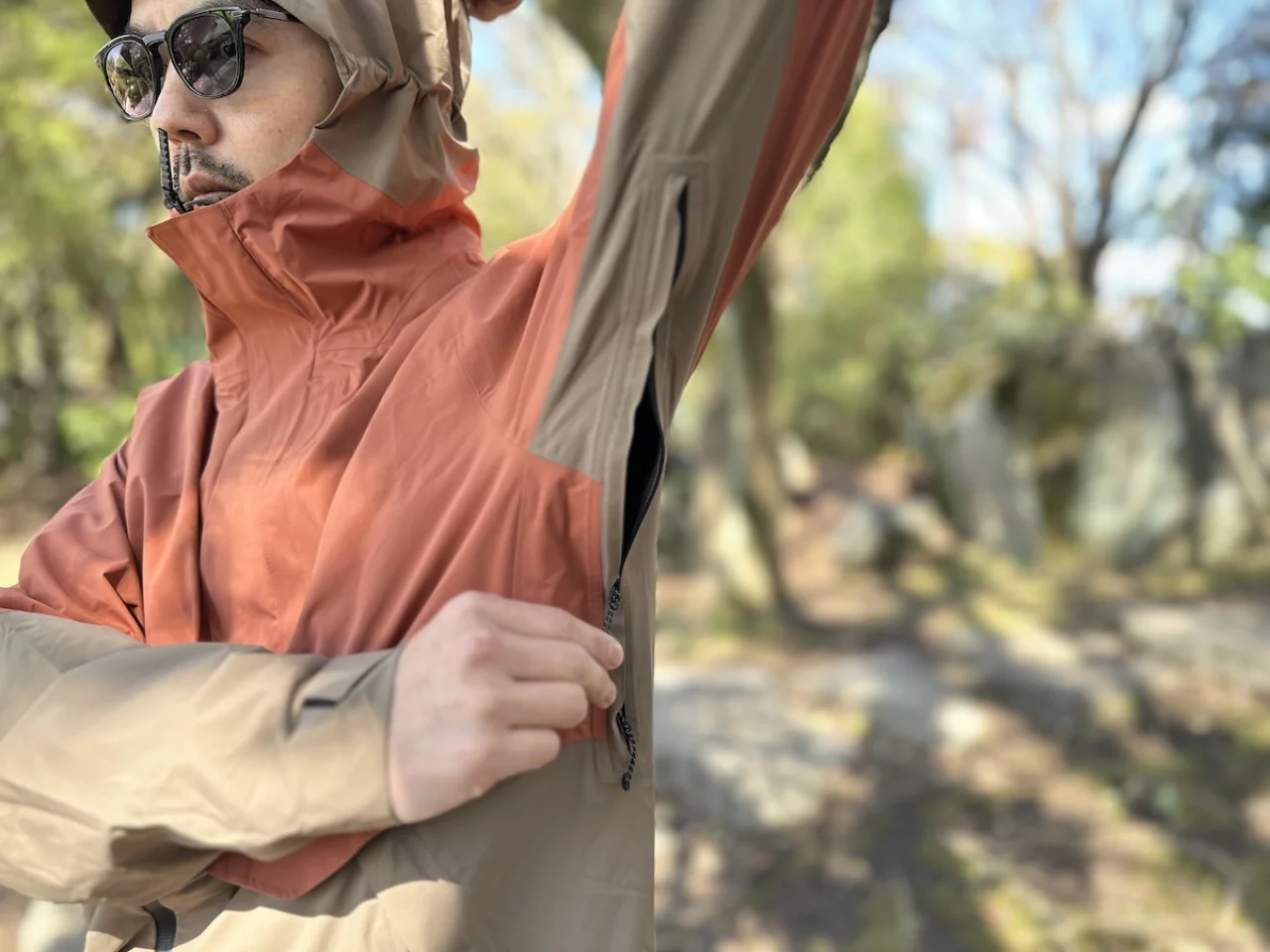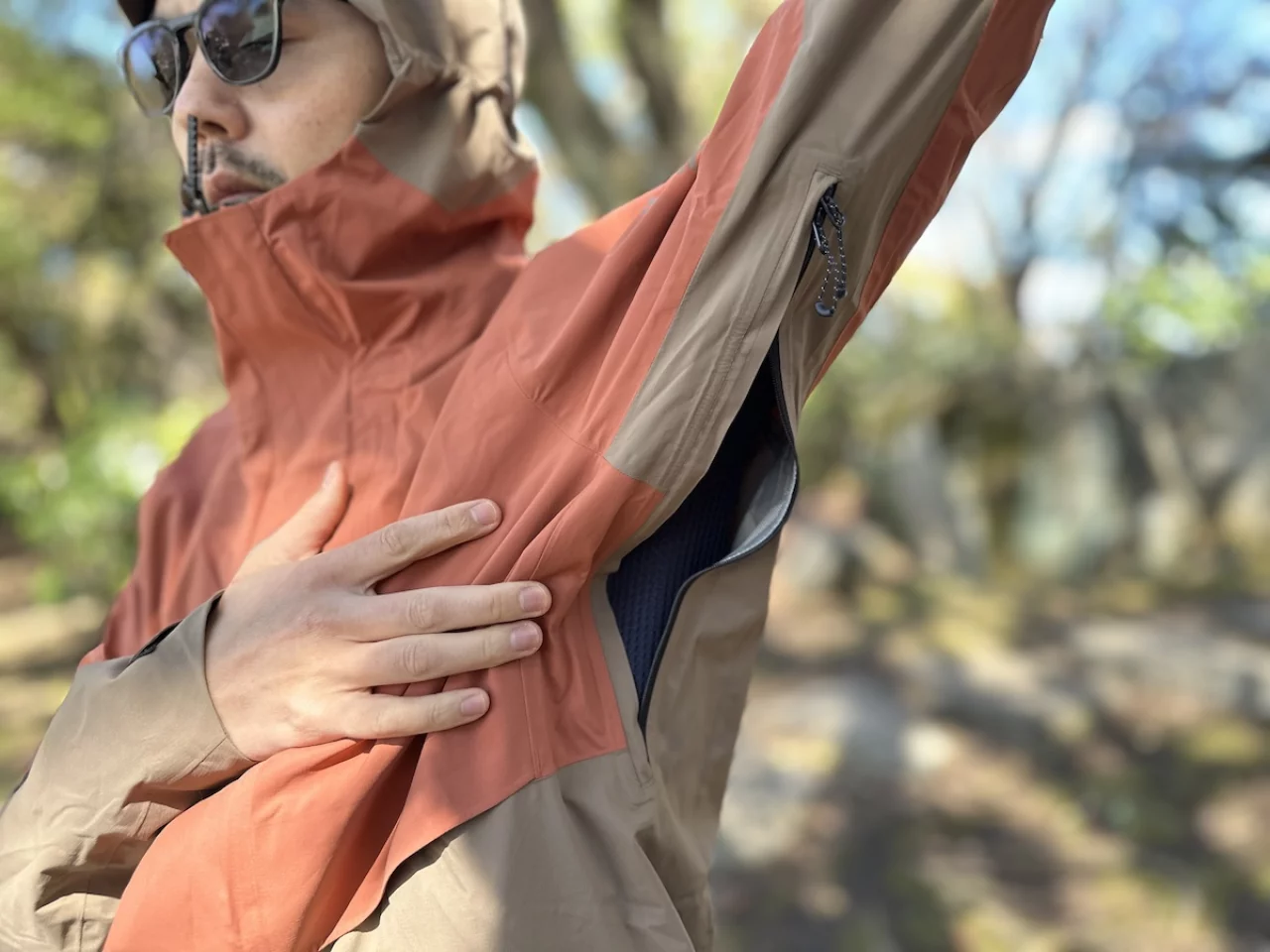 このレインジャケットは高い通気性を兼ね備えていながら、ピットジップを備えています。そしてこのピットジップはダブルジッパーなんだけれども、ジッパーが閉まった状態にある時に、上部と下部にジッパータブが位置するデザインです。これによって腕側もしくは脇下側の通気確保を素早く行うことができ、開ける時にジッパーが重ならないので、開け閉めを容易に行うことができます。今後この形がスタンダードになる予感がします。