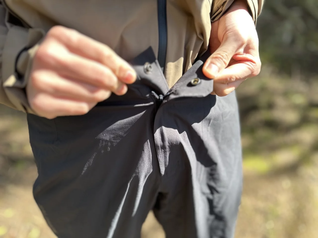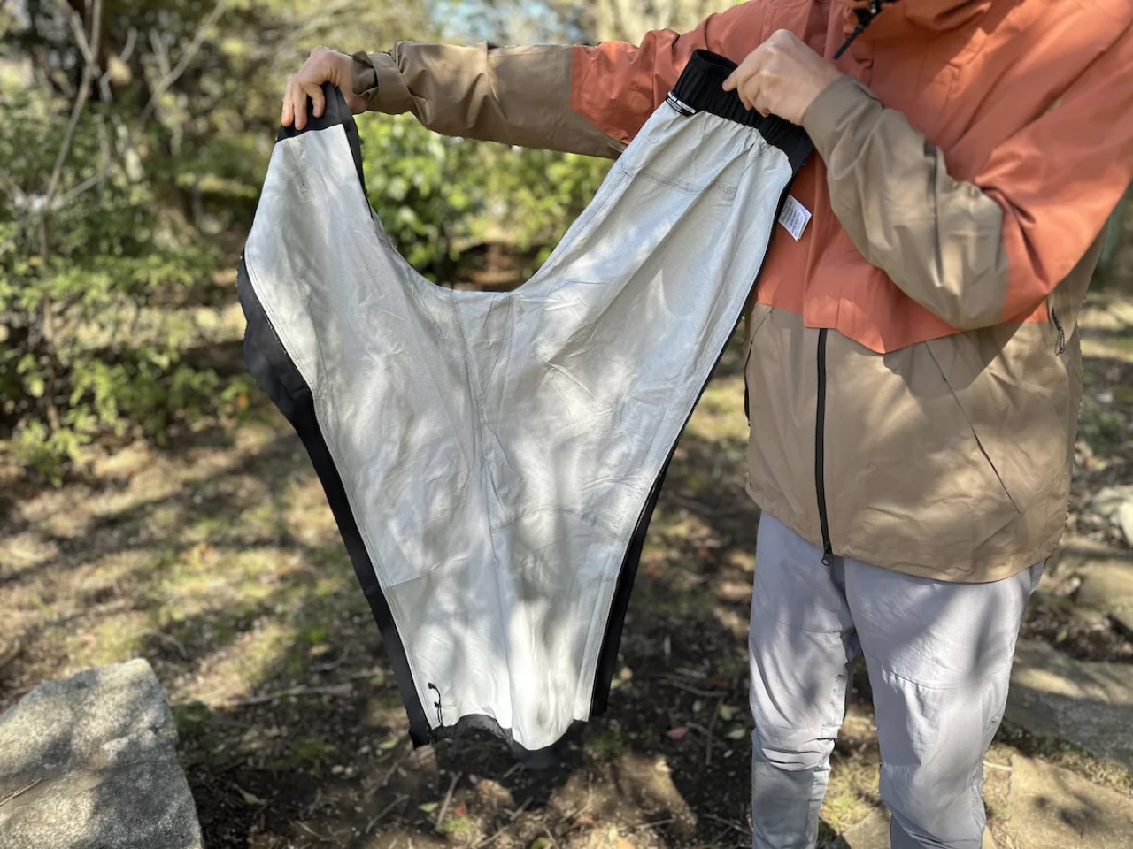 このレインパンツの最大の特徴は左右ともサイドのダブルジッパーでパンツの前と後ろを取り外すことができることです。僕が知っている限りこのように分解できてしまうレインパンツは見たことがありません。このサイドのダブルジッパーを活用することで通気を確保することも可能です。