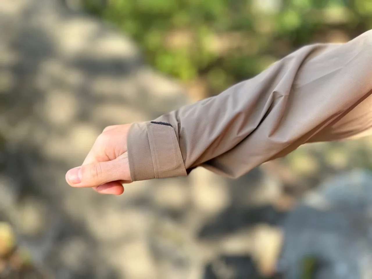袖口はベルクロテープで調整をすることができ、袖口は広く作られているので厚手のグローブをした状態で上からしっかりとフィット調整をすることができます。