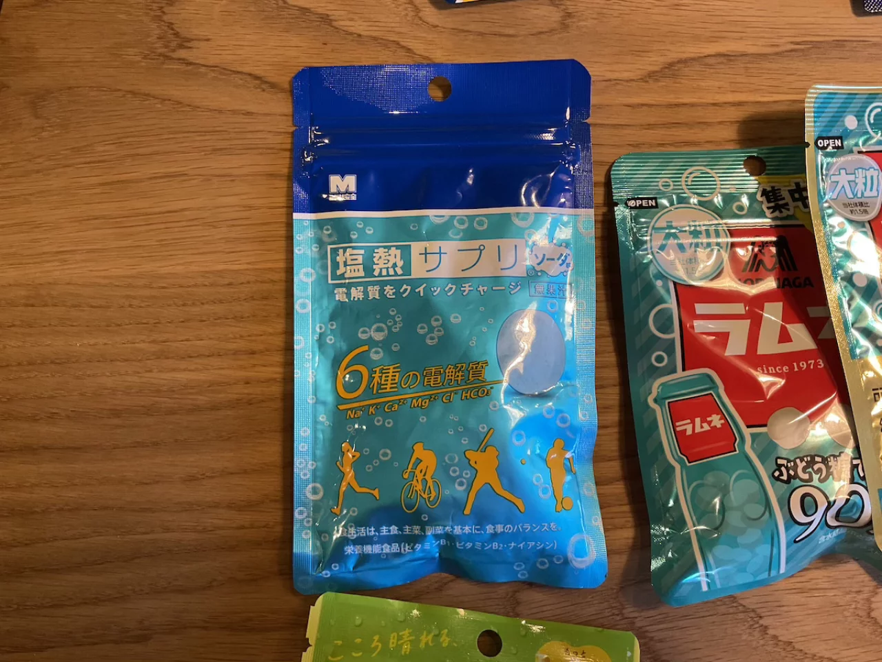 ミネラル補給に携帯しているのは塩熱サプリです。以前ドラッグストアで販売されていた塩タブレットを安いという理由で持ち歩いていたのですが、トレイルランニングで汗をかいて、この塩タブレットを摂取してもツリが治らないことがあって、それからはカリウムやマグネシウムなどが成分に含まれているものを摂取するようにしています。
