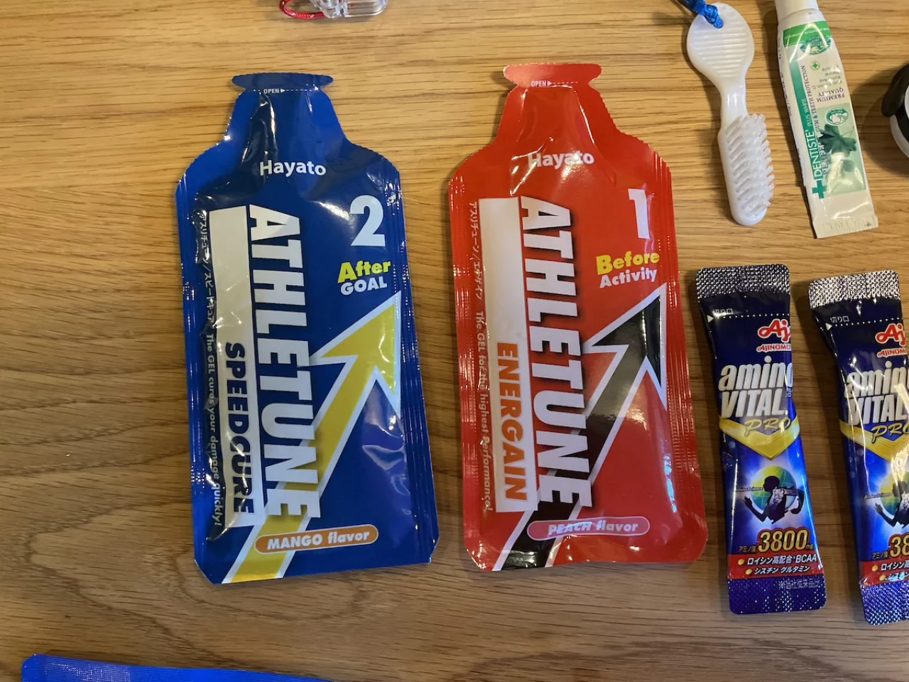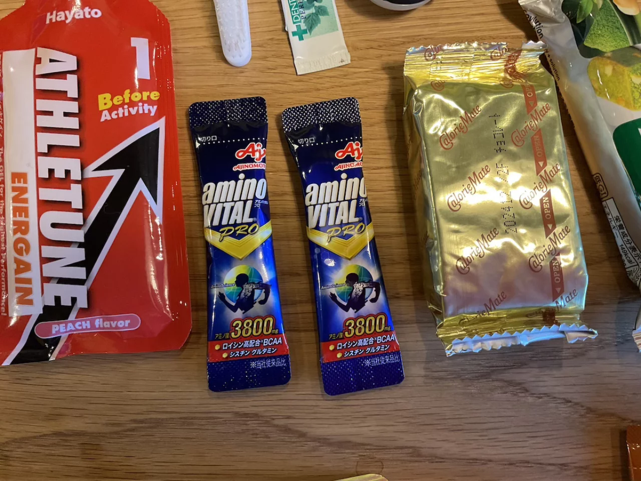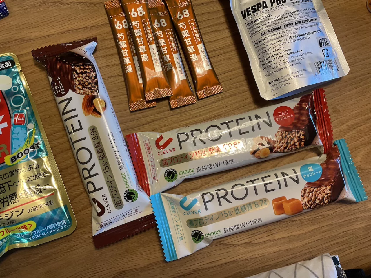 - アミノ酸:アミノバイタルやアミノサプリを行動前中後で摂取