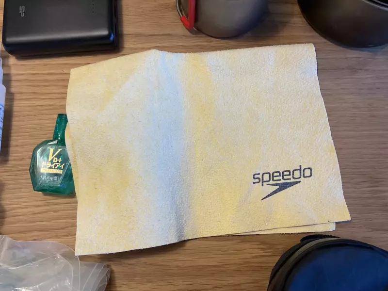 タオルはパックライトのウルトラライトとspeedoのセームタオルを使い分けています。セームタオルはパックライトのウルトラライトのように乾くと固くなりづらいので、肌触りがよく、また絞ると完全に乾いた状態ぐらいにまで戻るので、汗拭きタオルだけでなくテントについた結露を拭くのにも便利です。僕はシングルウォールテントを使うこともあるので、その時にはセームタオルはかなり重要なアイテムになります。