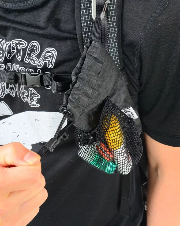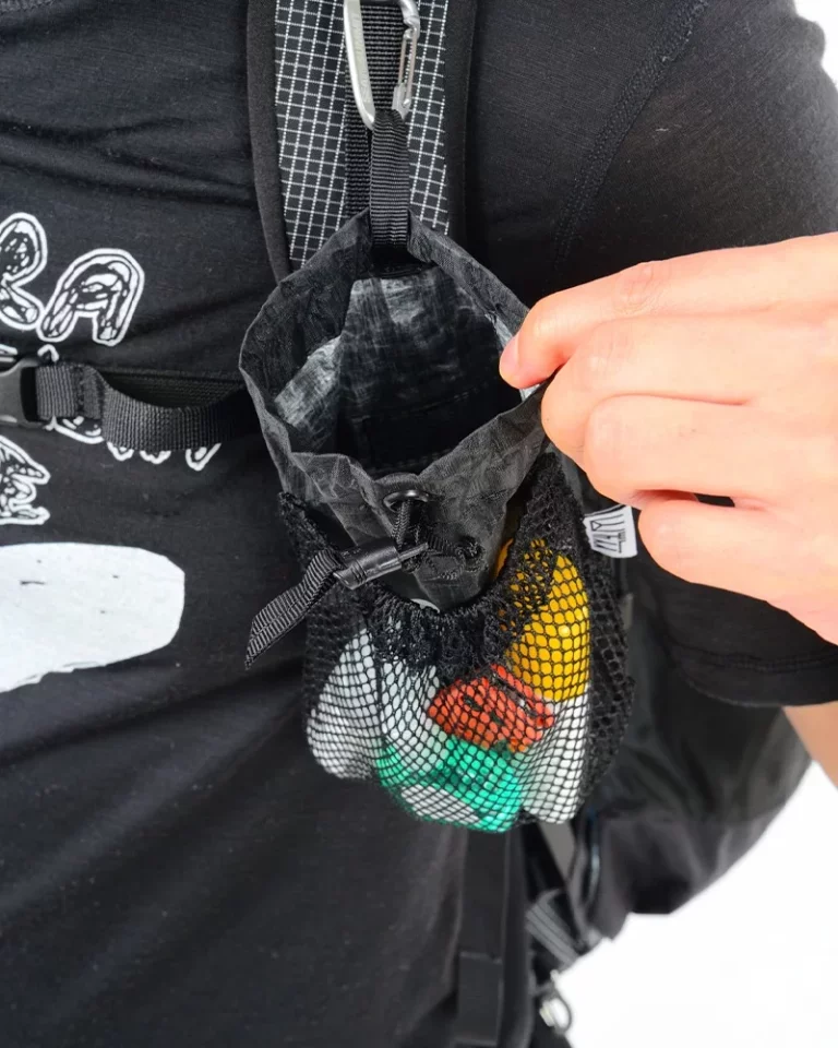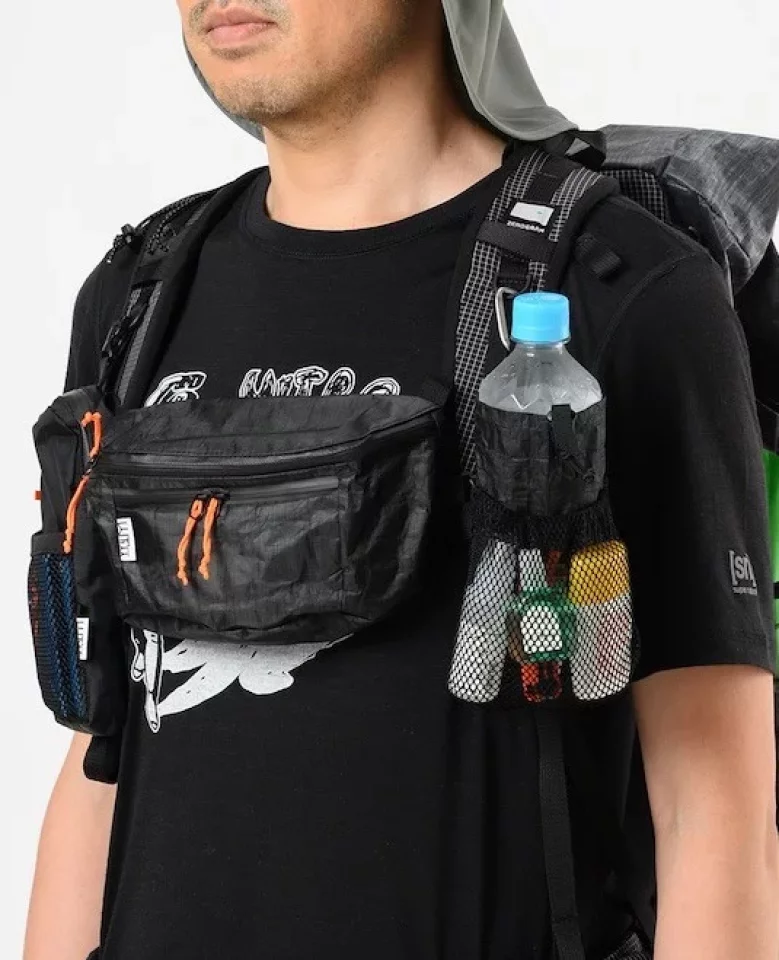 ポケット形状のアイテムです。ザックのショルダーハーネスに取り付けることができるので、水筒だけでなく行動食やコンパクトカメラ、動画撮影機器などを収納することができます。外側にはメッシュポケットが備わっており、メインポケットがパンパンになっても収納力を損なわないようにマチがついています。