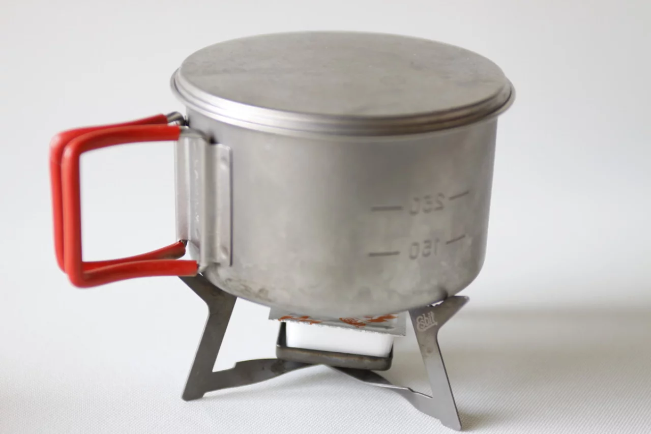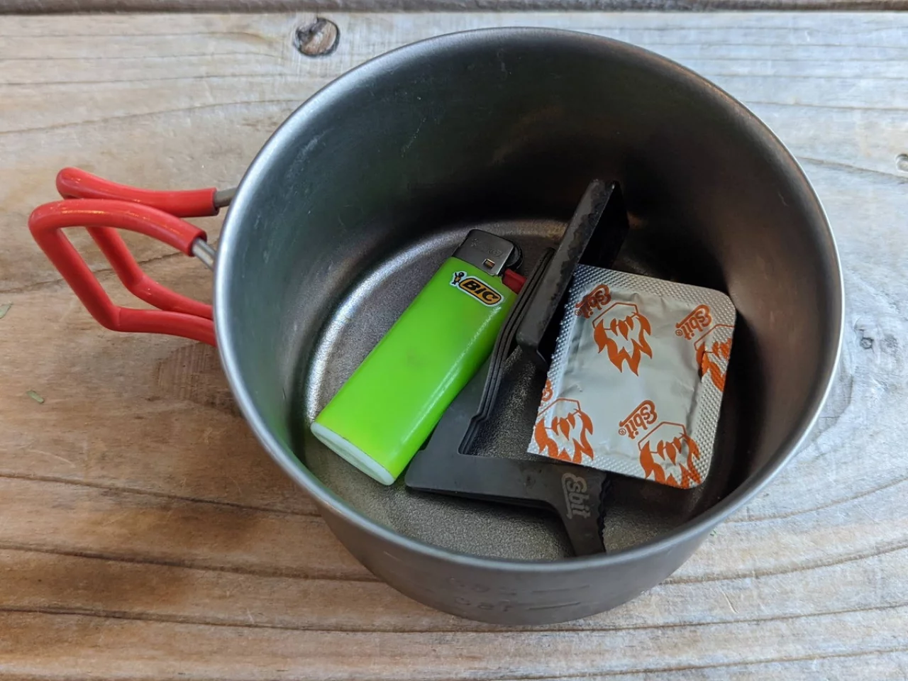 このように450mlのお湯があれば一晩の食事を作ることができると考えられます。そうするとクッカーはエバニューのTi570cupなどの軽量でコンパクトなクッカーでよく、このクッカーの中に上で紹介した固形燃料と五徳を収納し、ザックの中で蓋が外れないように山旅のクッカーケース500を使っています。