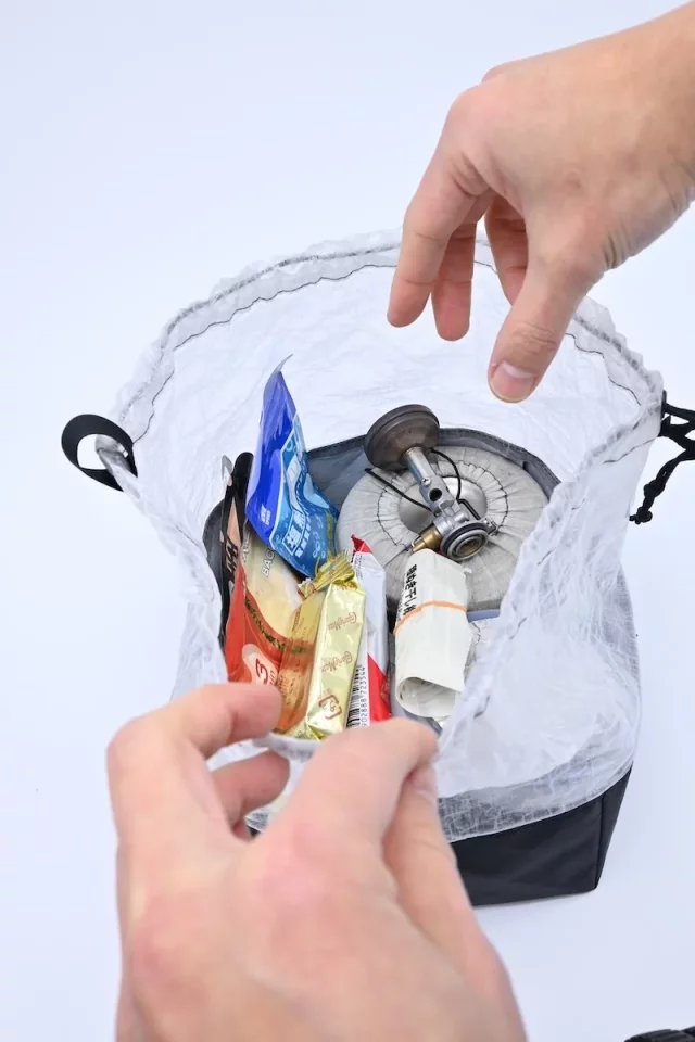 開けた時にはダイニーマの張りと、ボトム部分がX-PACなので、しっかりと自立して中のものが手で開かなくても見ることができます。