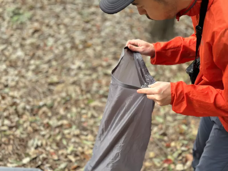 空気を抜く時はエアマットのバルブそのものを本体からはがすことで一気に空気を抜くことができます。エアマットから空気を抜くために圧縮させる必要もなくバルブを外したらそのまま折りたたんでくるくるとコンパクトにしてスタッフバッグに入れて撤収完了です。
