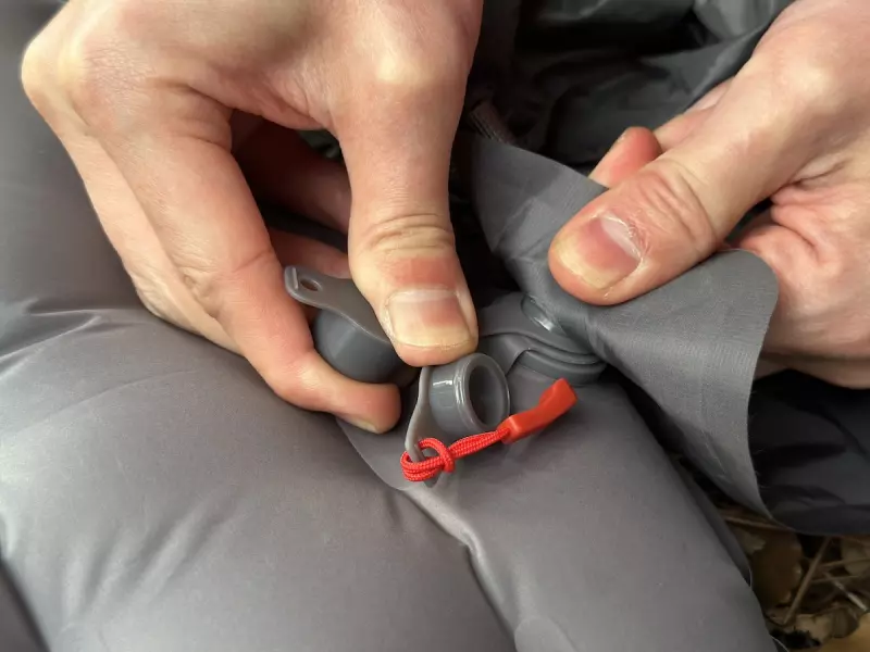 取った後もエアマット側のバルブには弁がついているので勝手に空気が抜けません。エアマットの空気調整はバルブの中心に備えられた赤い突起部分を上から強く押すことで空気が抜けます。これを使ってエアマットの柔らかさを調整することができます。