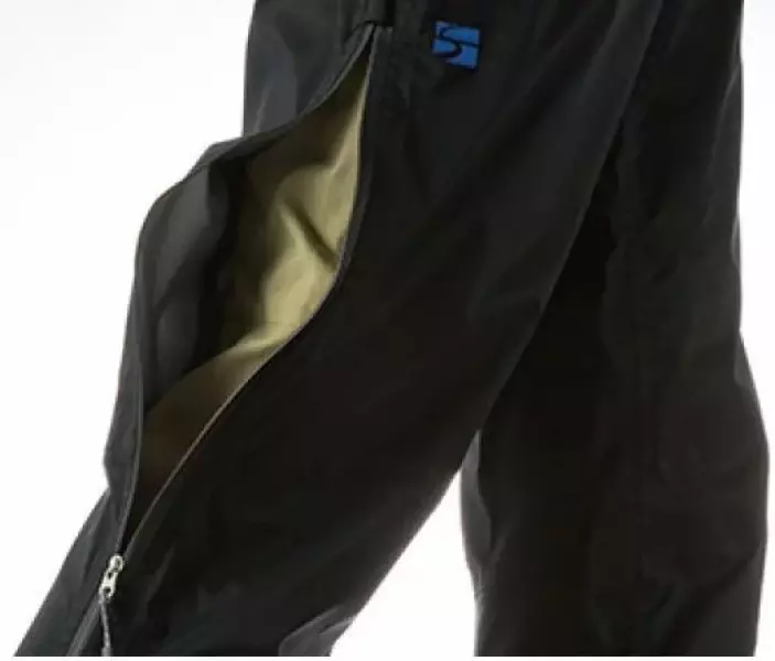 太腿まである長いサイドファスナーは、ダブルファスナータイプです。登山靴を履いたまま着用しやすく、暑くなった時は開放して、ベンチレーションの役割を果たします。