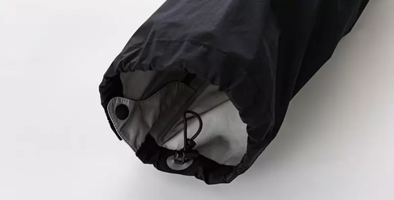 裾部分には、裾を絞れるスナップ付きです。ジャストサイズに調整することで、雨の侵入や風によるバタつきを押さえます。