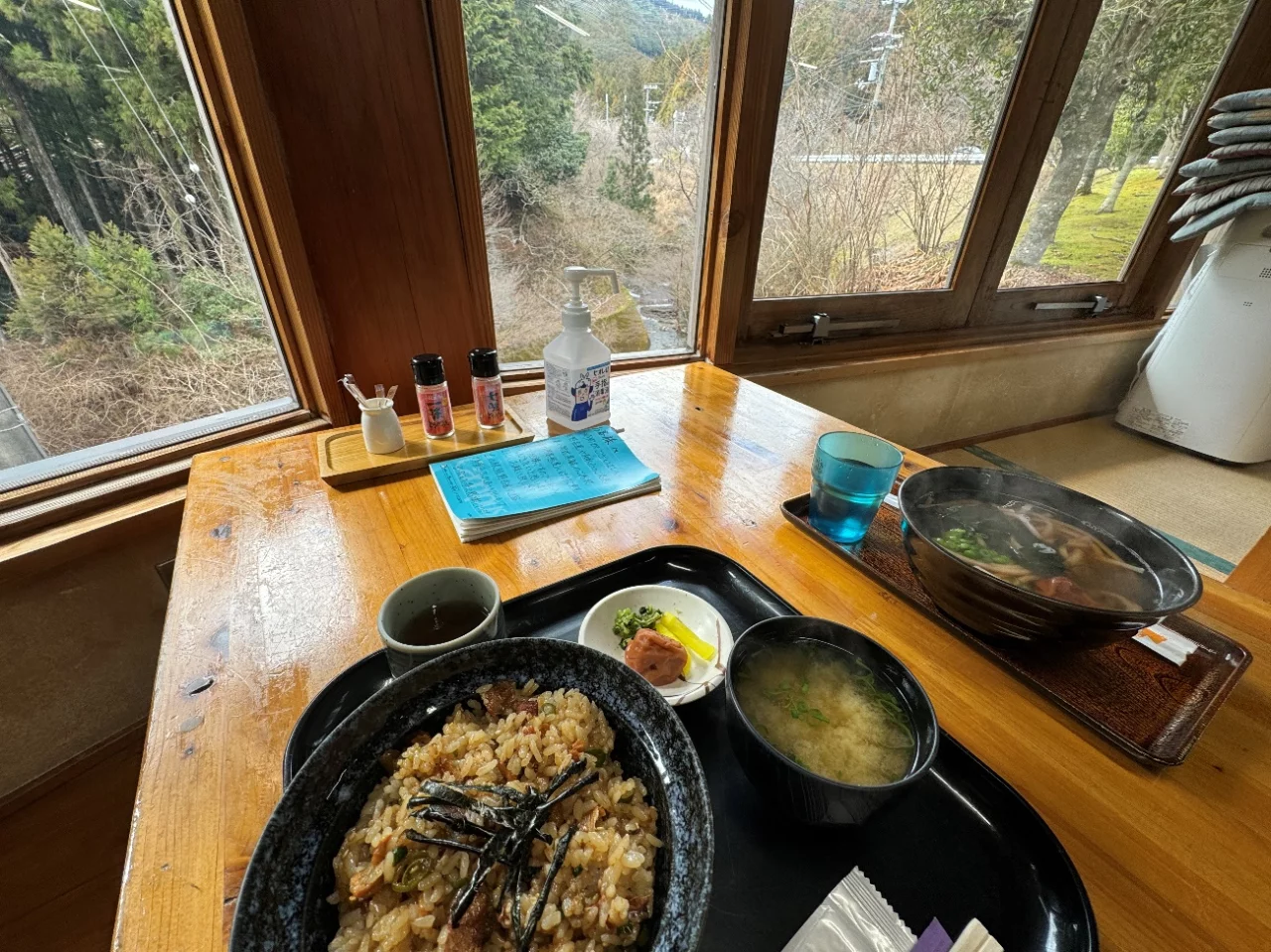 山の中の温泉地は食べるところを探すのに苦労することが多いのでご飯付きにするのがポイントです。その点みどりやさんは朝晩二食付いているだけでなくなんとなんと、次の日のお昼用のおにぎり弁当までついていました!(買う所がなく後々助かりました)