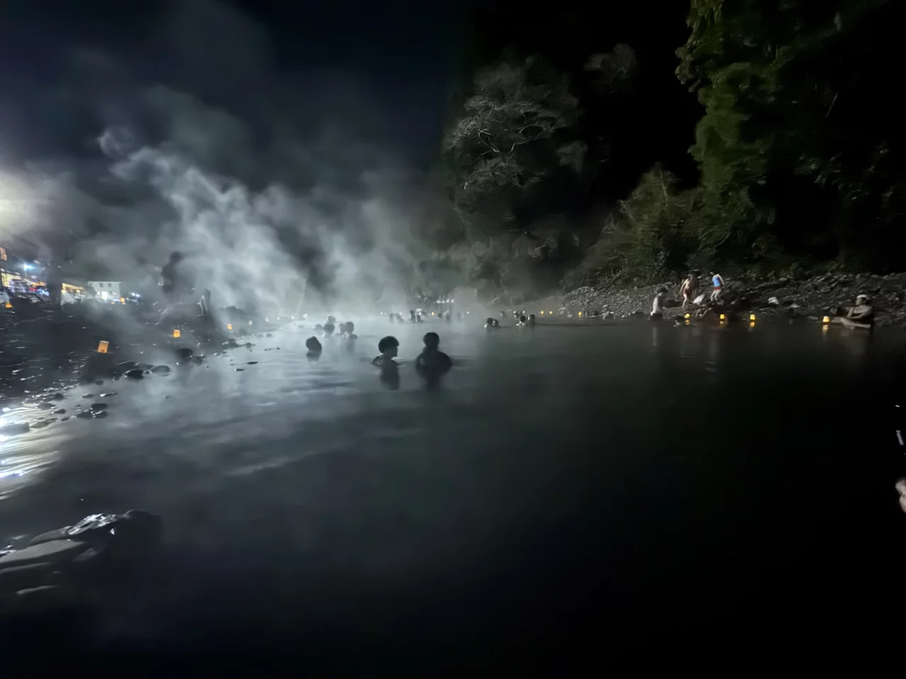河原をせき止めて作る大露天風呂は、老若男女無料で入れます!