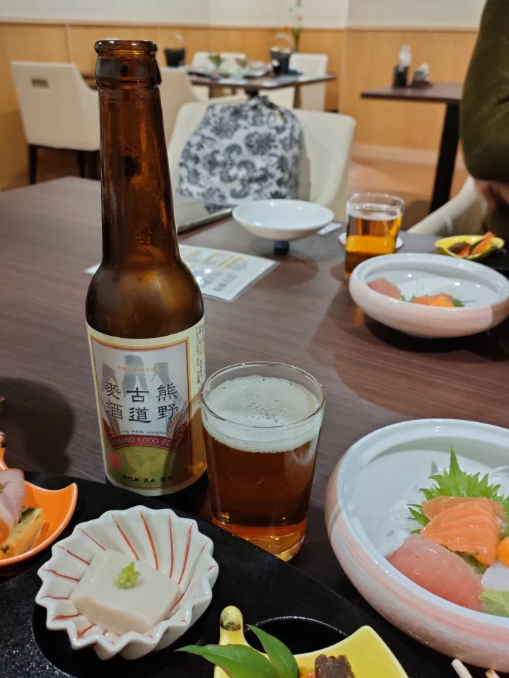熊野古道ビールで乾いた喉をうるおしました。本場のごま豆腐もついてて嬉しい上にお刺身に牛鍋が前菜。他に食べ放題メニューまでついています。せっかくなので鮎の塩焼きを食べまくりました(笑)