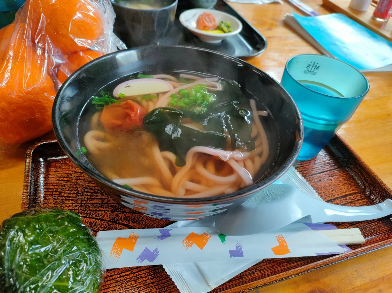 写真左下の緑色は名物の「めはり寿司」(130円)です。地物の「ぽんかん」(4個200円)も食べて大満足です!