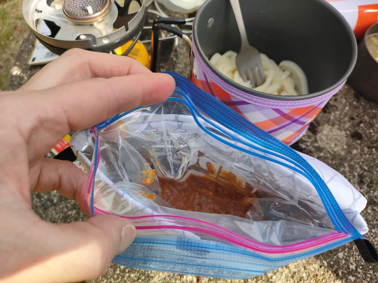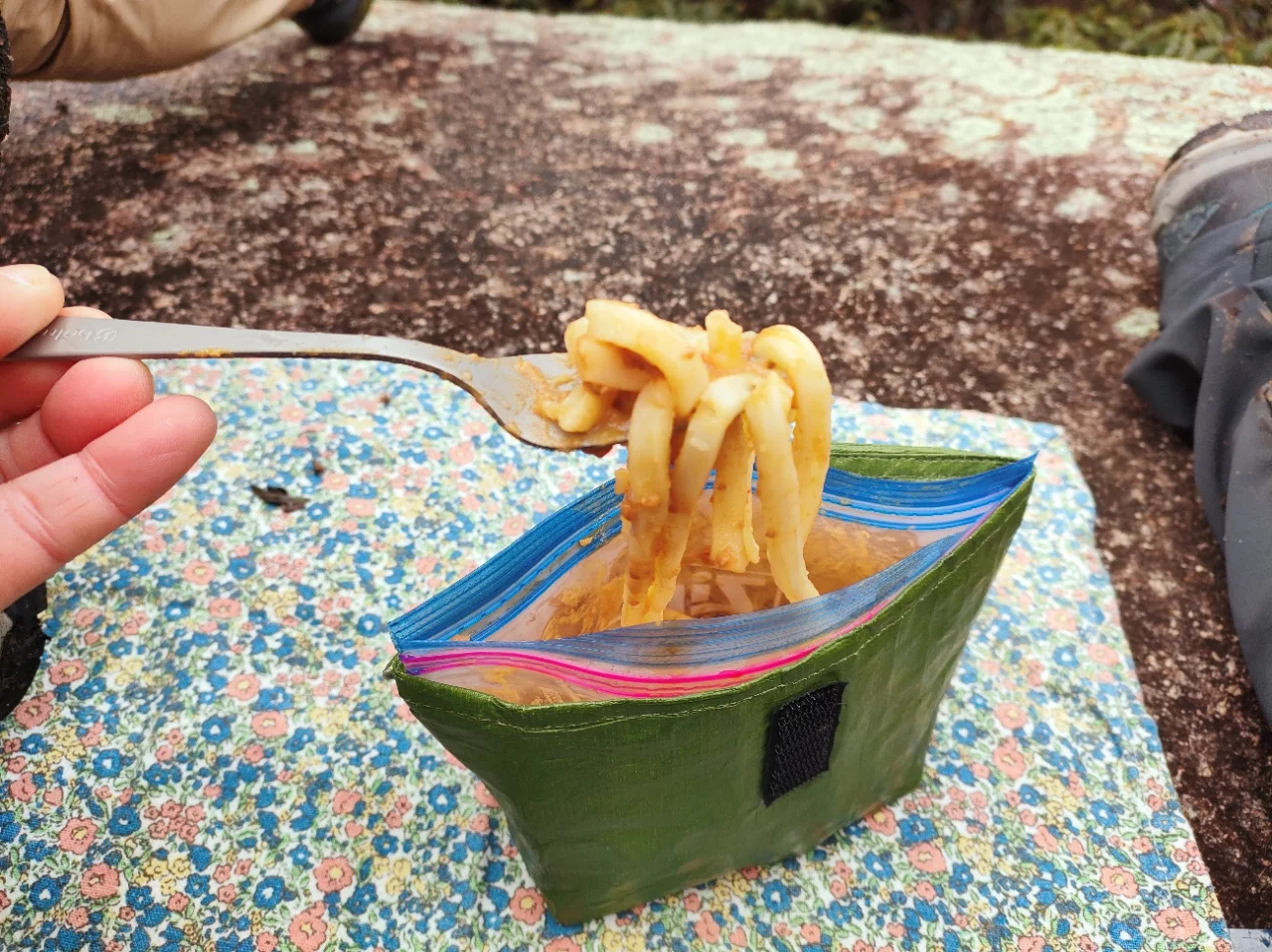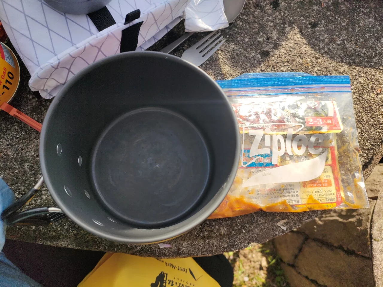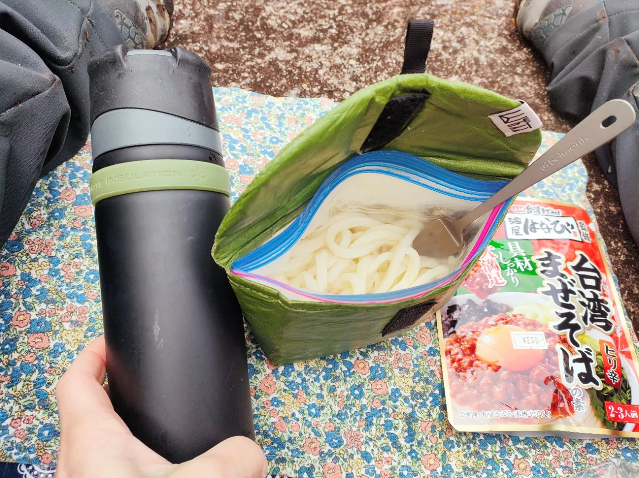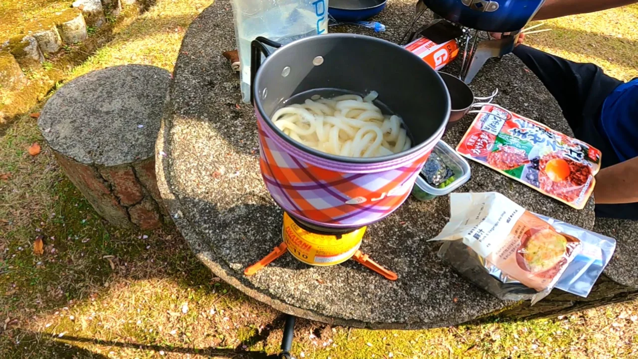 ステンボトルで一回湯切りしただけではコジーの力を借りたとしてもうどんはアツアツにはならず、シェラカップのスープもちょっとぬるかったけど、それでもじゅうぶん食べられるメニューになりました。