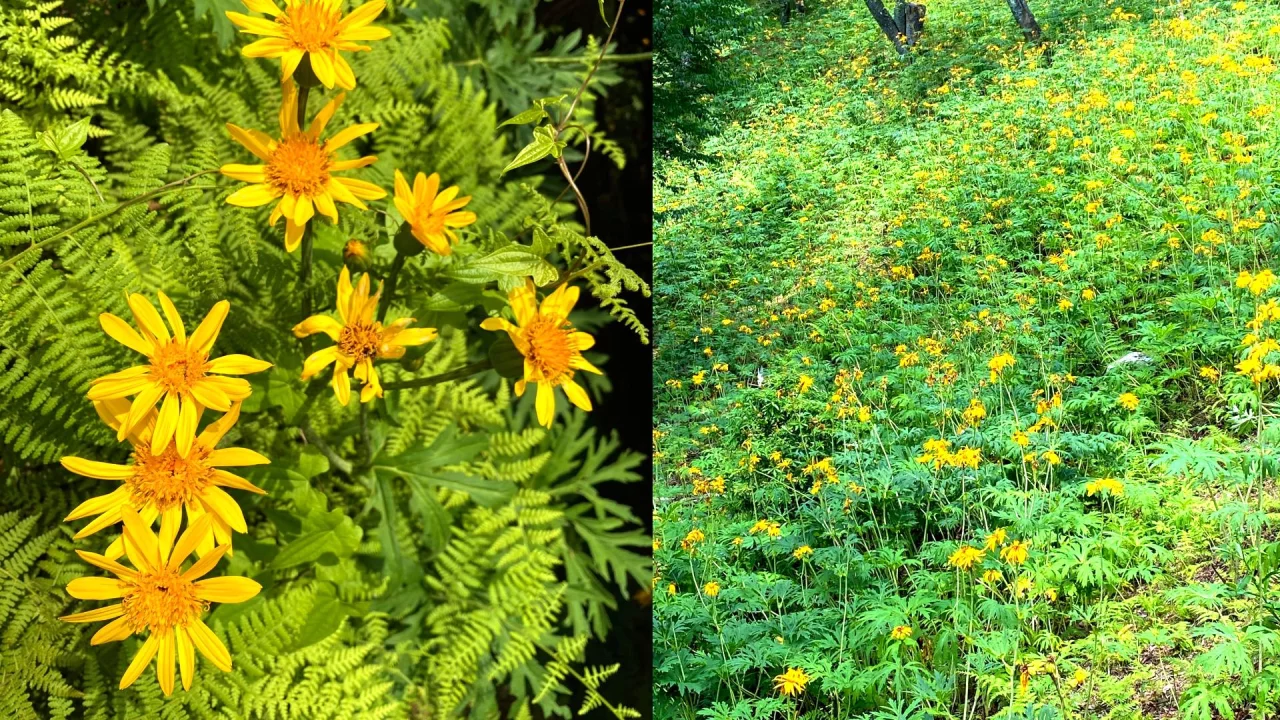 6月からは半月ほど楽しめるハンカイソウの黄色い絨毯は谷まで一面に広がり、ヤマツツジにも会えます。紅葉の秋まで待てずにまだまだ足を運びたくなる山です。