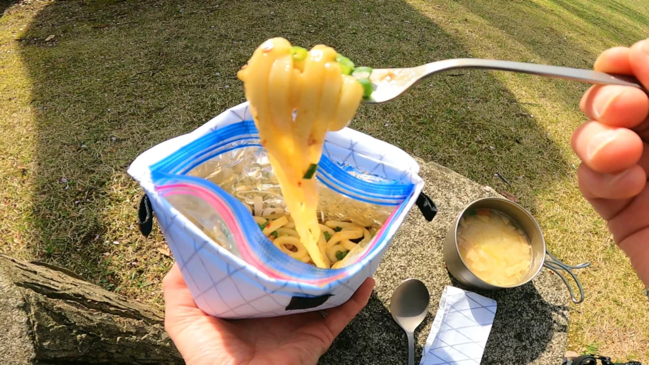 ⑤コジーにセットしたら、クッカーのうどんを全部ジップロックに移して底からよく混ぜます。ネギと海苔をトッピングしたらもう完成です。
