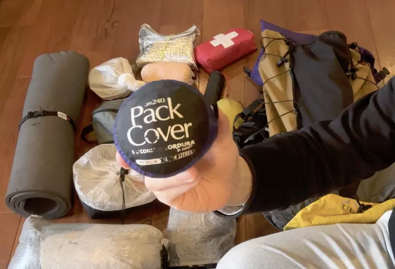 カバーはシートゥサミットのパックカバーを活用しています。最初の展開で、僕が持っているのは50から70リットルをカバーするMサイズです。Mサイズで113gと僕が知っている中では、最も軽量なバックカバーです。