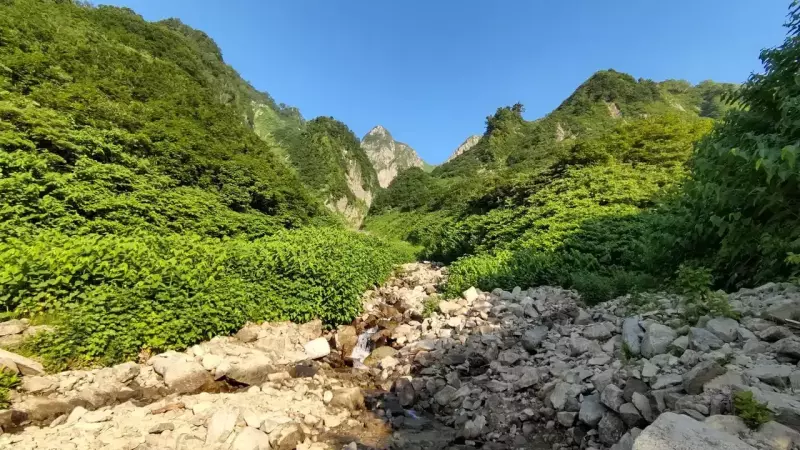 ブナ平を過ぎ歩を進めると視界が開け、荒菅沢を越える手前に白い岩肌の「布団菱」が見えてきます。少し下って荒菅沢を渡渉すると、休憩に程よいスペースがあるのでこの先の急登に備えて呼吸を整えましょう。