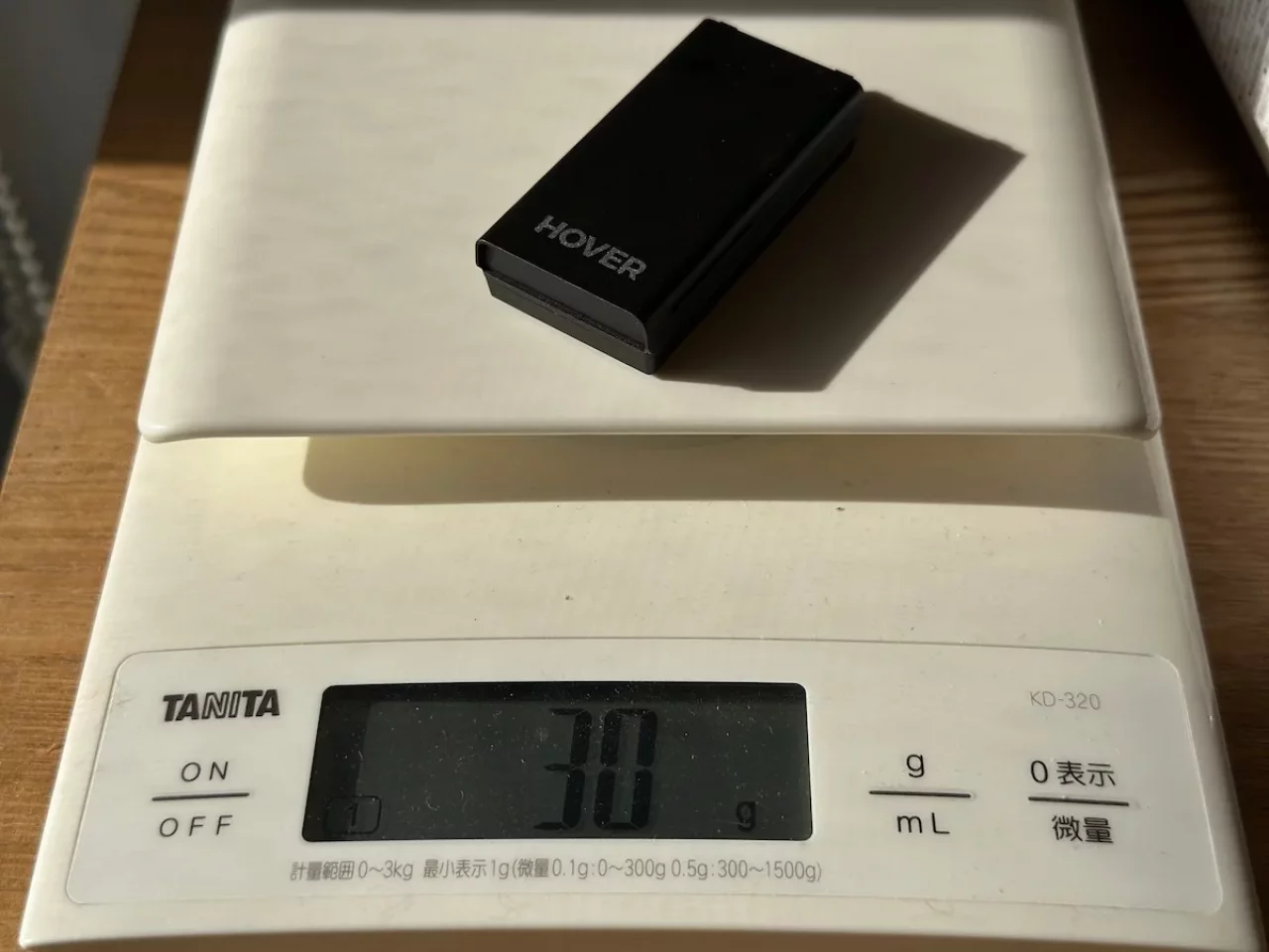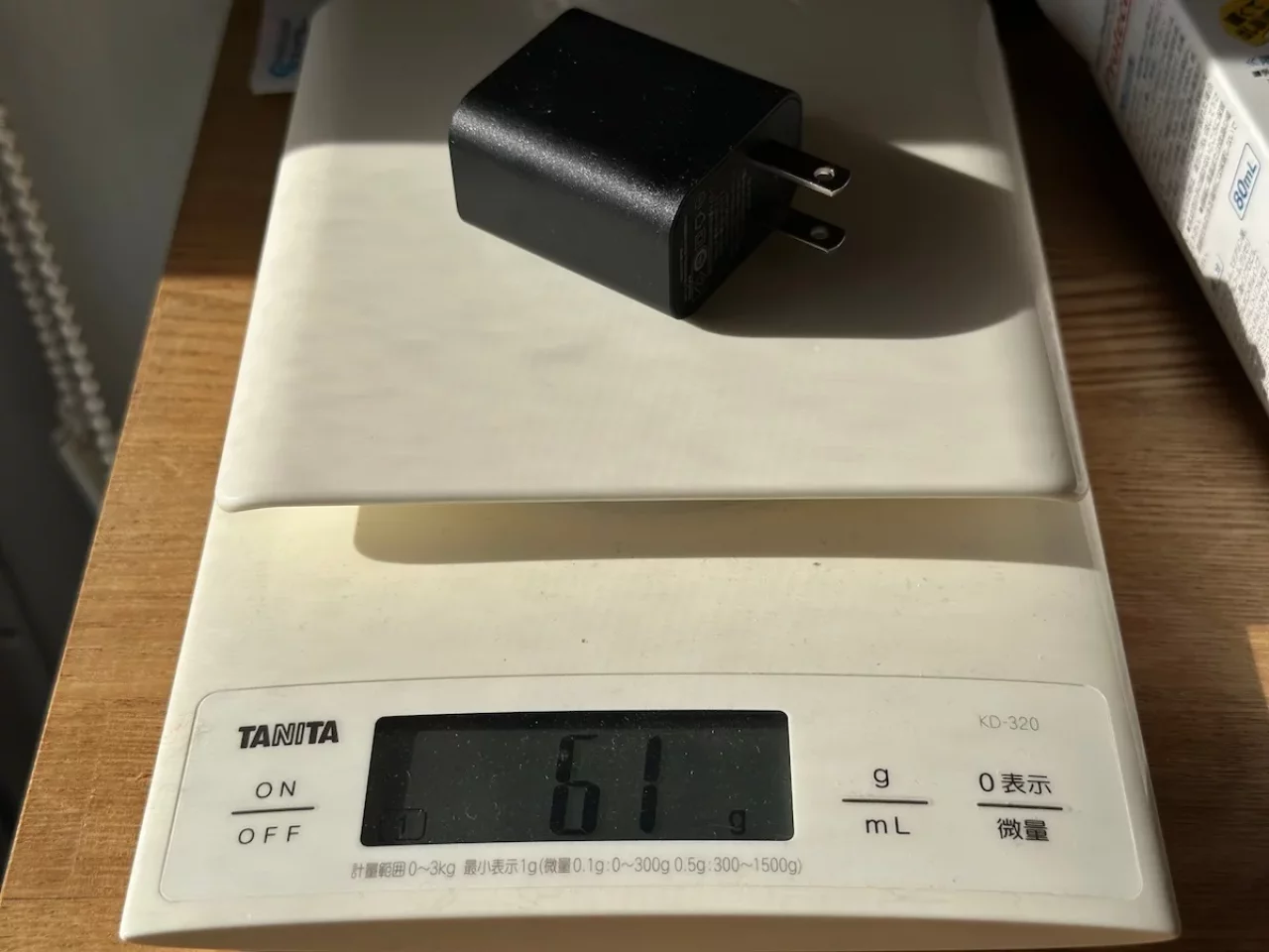 バッテリー単体の重さが30g、バッテリーが2つ付いた状態の充電器の重さが180g、アダプターの重さが61gです。