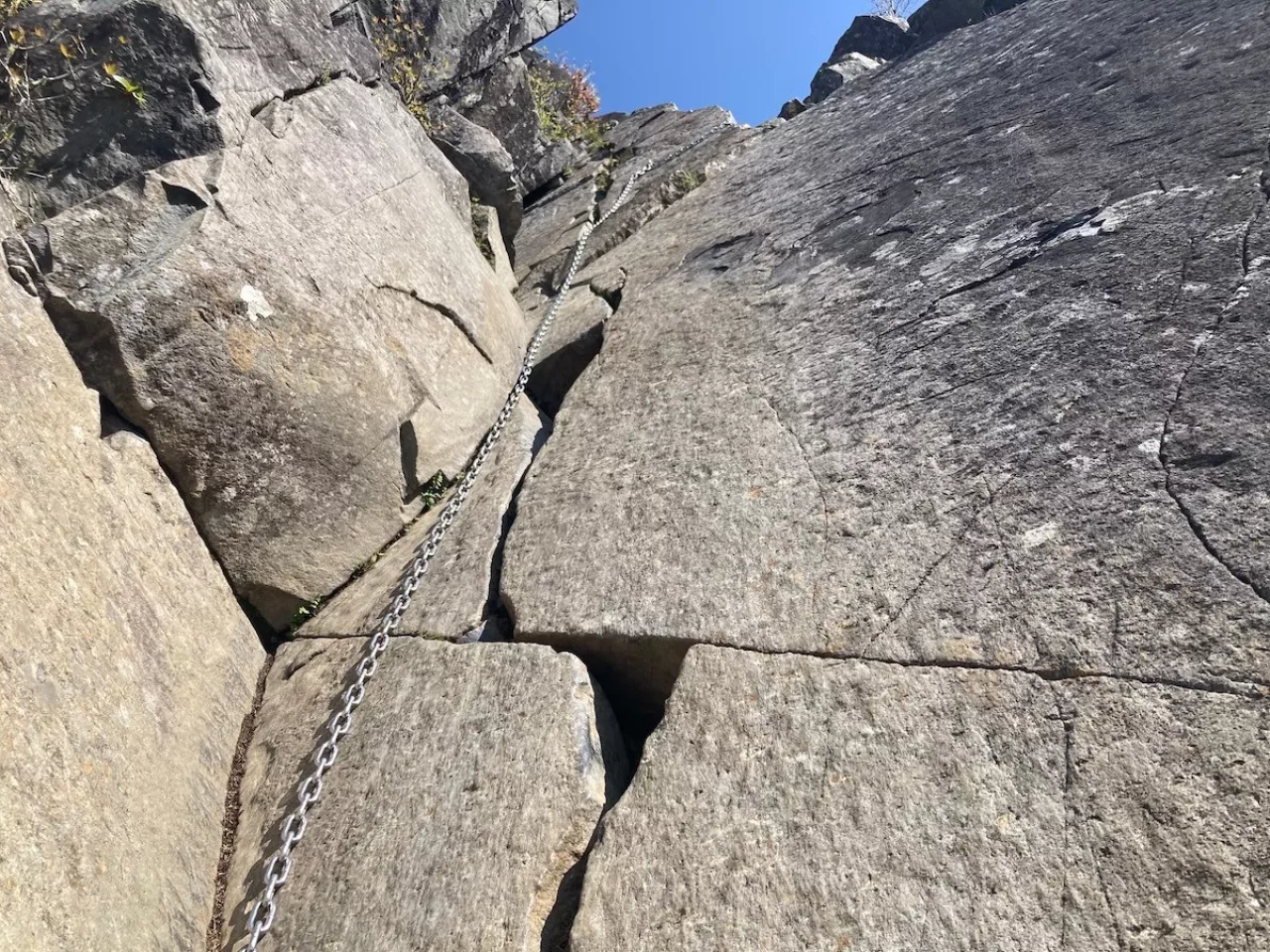 高さは約20mで、ほぼ垂直な岩壁で、緊張する場面ですが、足をかけられる場所はしっかりとあるので振り返らずに登り切りましょう。(途中に一旦一息つける場所もあるので慌てずに)