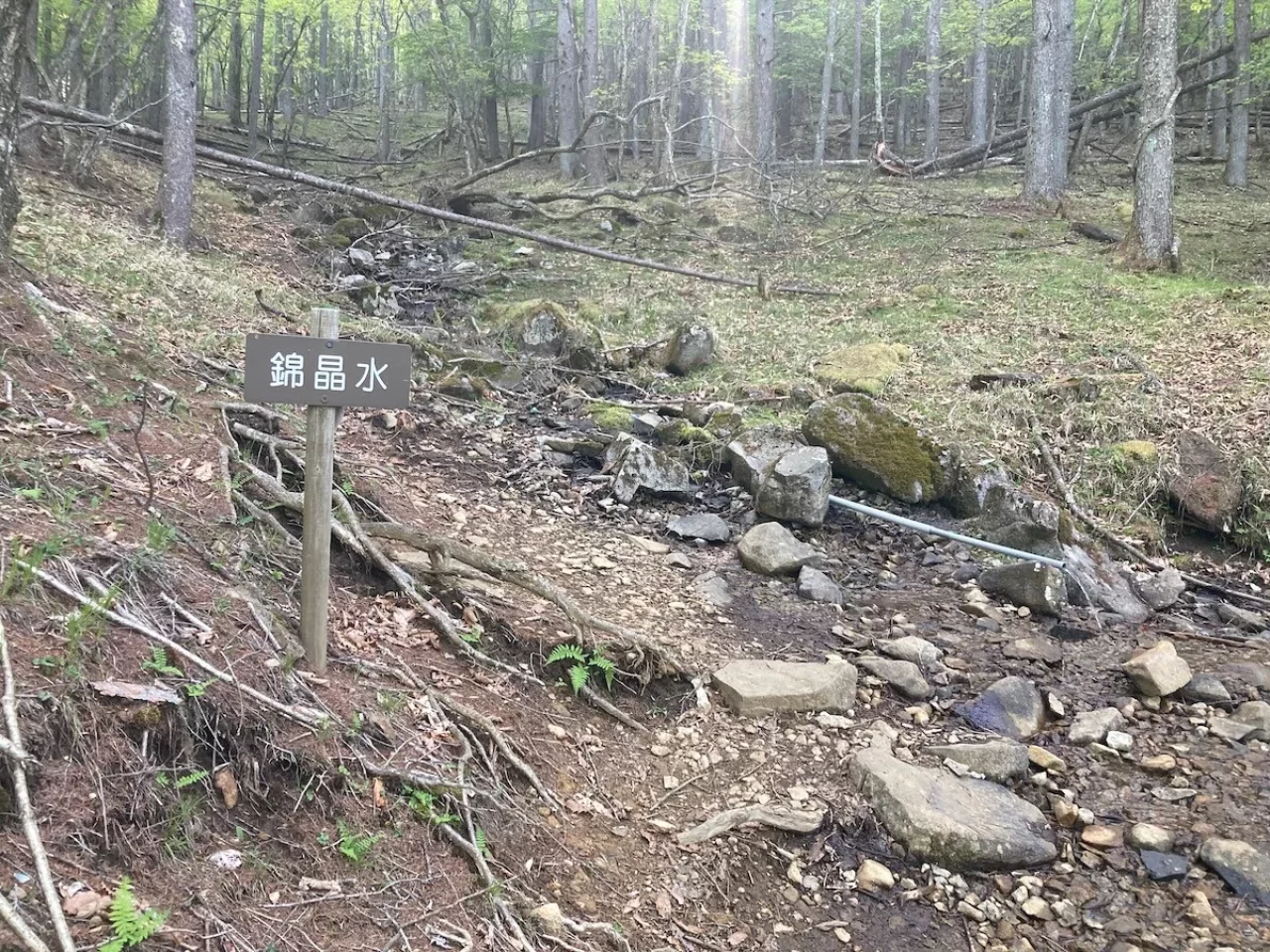 登山口から1時間ほど歩いたところに「錦晶水(きんしょうすい)」という名の水場があります。