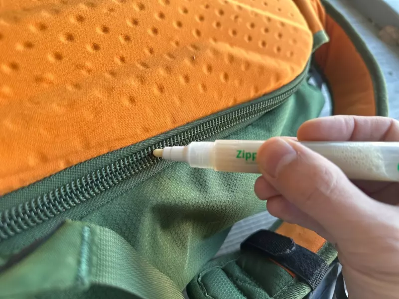 塗り方は簡単で、ジッパーワックスのペン先を強く押し込むとペン先にワックスが滲み出てきます。その後締めた状態のジッパー部分に軽く抑えるように塗布して、ジッパーを数回往復させなじませていきます。ジッパーの滑りが悪いところは何度か繰り返してなじませていきます。