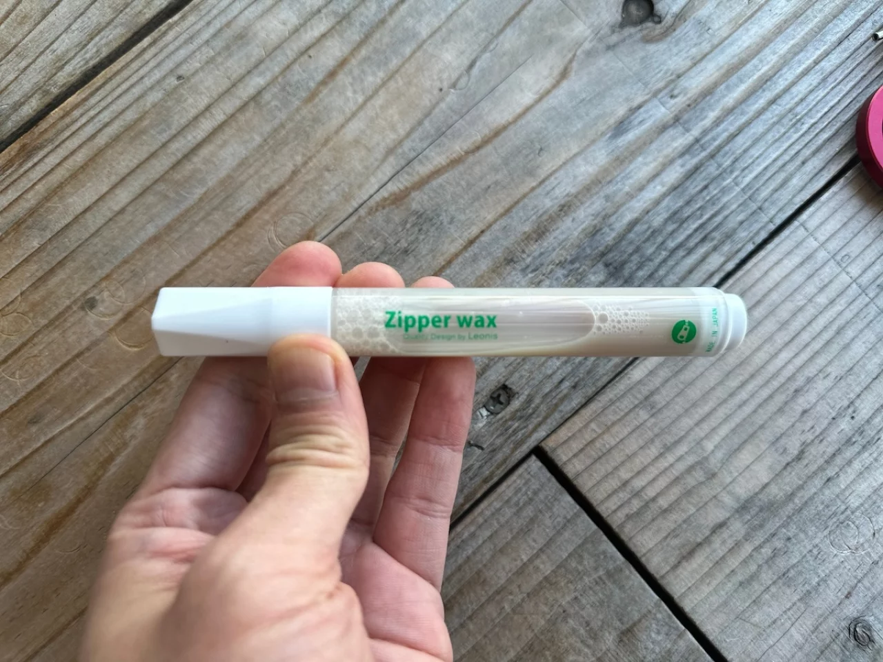 だからジッパーワックスをありとあらゆるジッパーに塗布して、滑りを良くします。ジッパーワックスを使わなくてもロウソクのロウを塗るのでも同じ効果を実感できます。僕はたくさんのジッパーに頻繁に塗布するのでペンタイプで塗りやすいジッパーワックスを使っています。