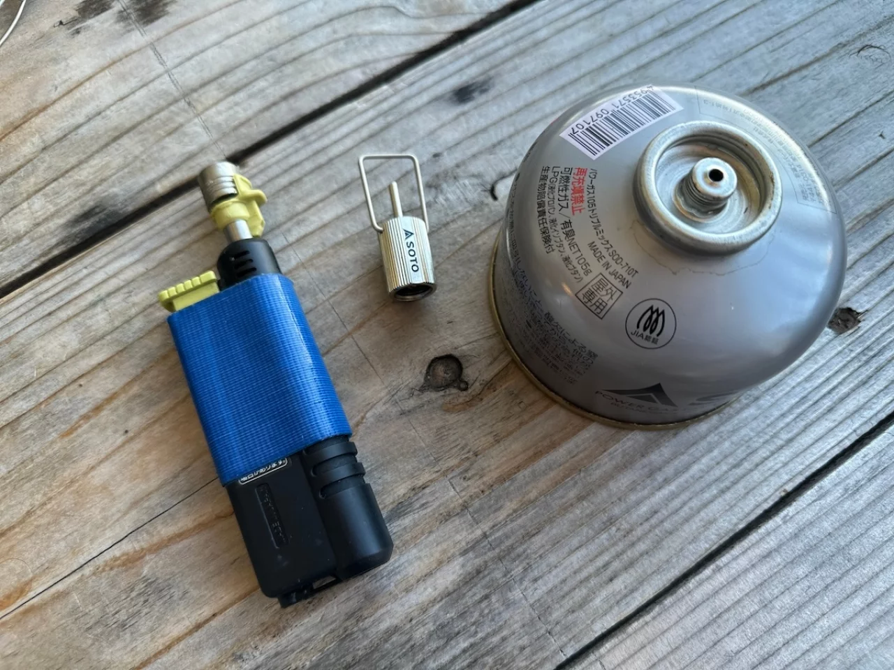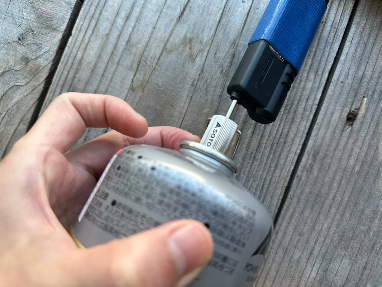 OD缶に少しだけガスが残っている時に皆さんはどうしていますか?僕はSOTOのフィルアダプターを使って充てん式ガストーチにガスを充てんしています。使い方は簡単でOD缶の先端部分がねじ式になっているので、この部分にフィルアダプターを回して装着します。