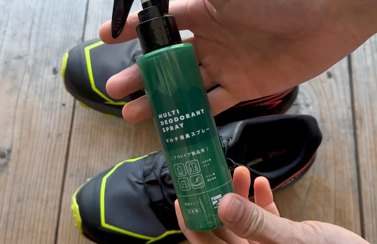この消臭スプレーは肝臓や腸内環境の悪化によって皮膚から出るアンモニアガスによる疲労臭、イソ吉草酸と呼ばれる足で増殖した菌によって生じる酸っぱい匂いなどに効果がると実感しています。天然樹脂の樹皮から抽出された天然ポリフェノールが配合されたサスティナブルな成分なので、安心して使用することができます。靴には片足5プッシュ程度。ザックやテントやウェアなどは20cmほど離して全体が軽く湿る程度にスプレーします。