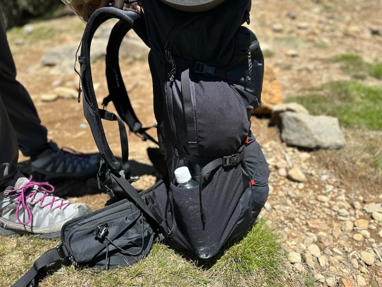 サイドにはフロントポケットの下部に設けられたメッシュと同じ素材のメッシュポケットが2つ備わっており、ボトム部分の小さなポケットにはボトルなどを収納しておくのに便利です。また上部には何を入れるか迷ってしまいますが、グローブや行動食で出たゴミなどを収納しておくのに便利です。