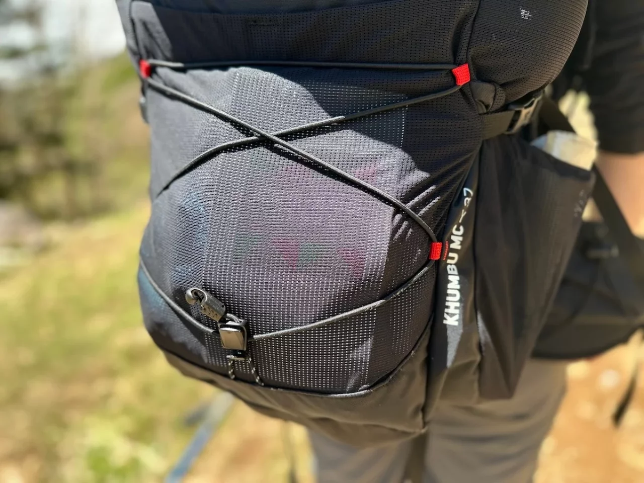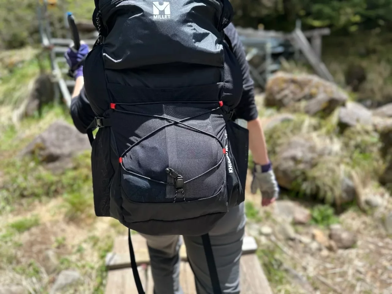 ザックの中心から下の部分にはメッシュポケットが備わっておりバンジーコードで外側から圧縮することができます。この部分には登山中にすぐに取り出したいレインジャケットやザックカバーなどを収納しておくのに便利です。