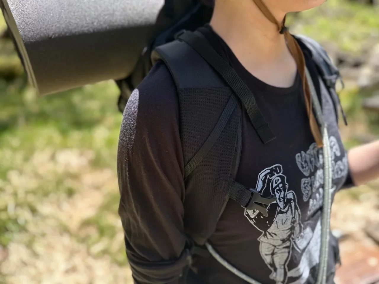 まずはじめに背負って思ったのは体へのフィット感です。比較的軽量なモデルだからショルダーハーネスのクッション性は豊かでしっかりと幅のあるショルダーハーネスとウエストベルトで体をしっかり固定します。
