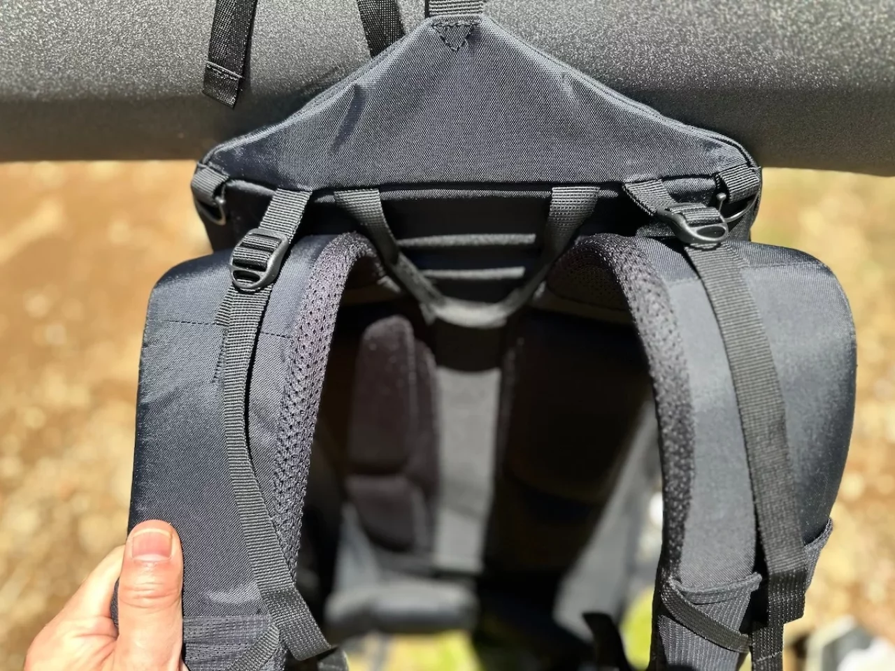雨蓋はついておらずシンプルな作りなのは個人的に好きな点です。ザックの中に装備を詰め込んだら上部のストラップをバンジーコードの好きな位置に引っ掛けて固定をします。残念なポイントとしてはこのバンジーコードに引っ掛けるプラスチックハードウェアがバンジーコードに引っ掛けづらいデザインで、ここは少し改良して欲しいなと思いました。