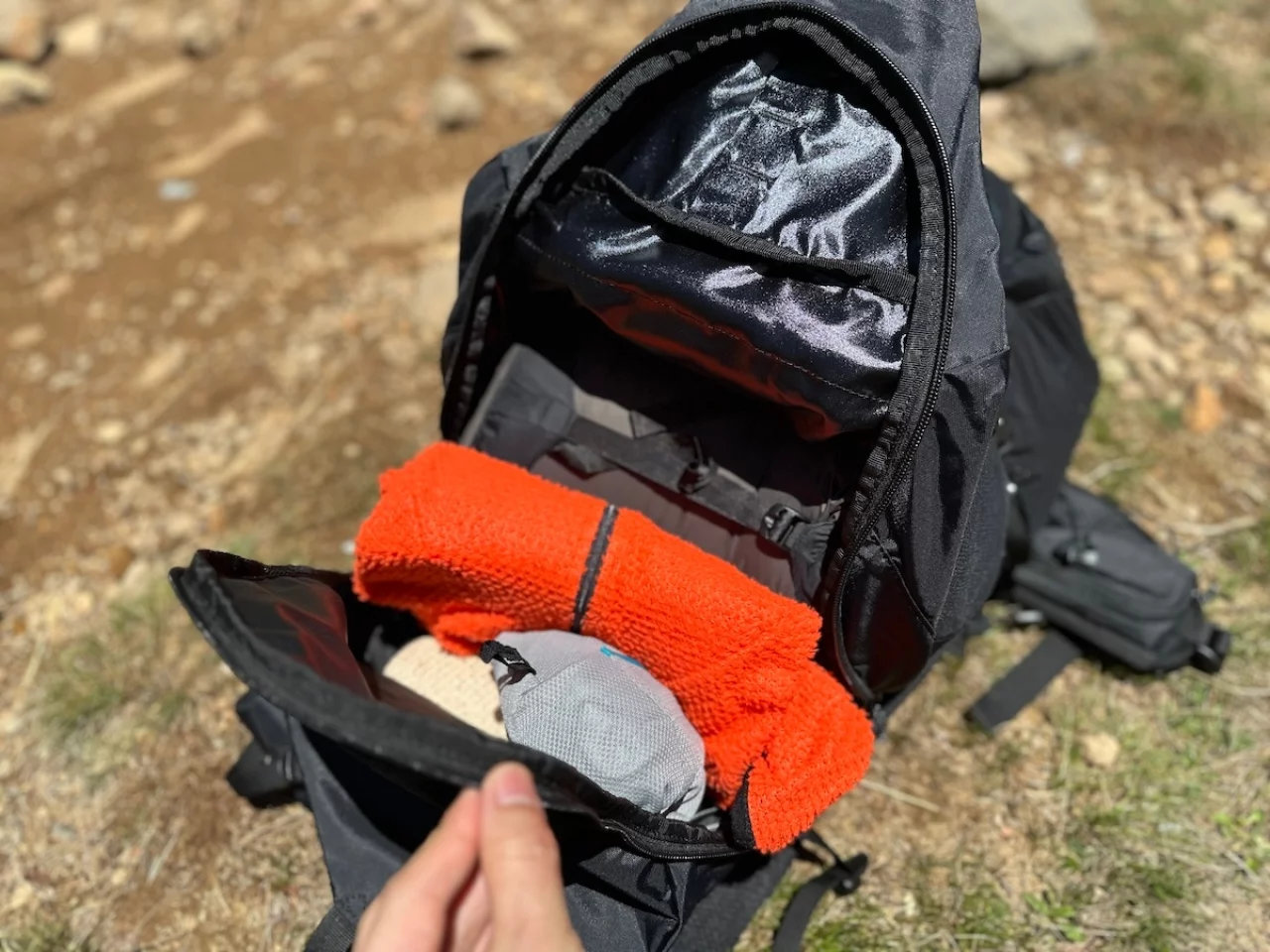 メインポケット内部にはノートパソコンを収納できるスリーブポケットが備わっています。ショルダーにもメッシュポケットが備わっており、この部分にはボトルやスマートフォンなどが収納できる大きさではないので行動中にすぐに手に取りたい行動食などをしまっておくのに良いでしょう。