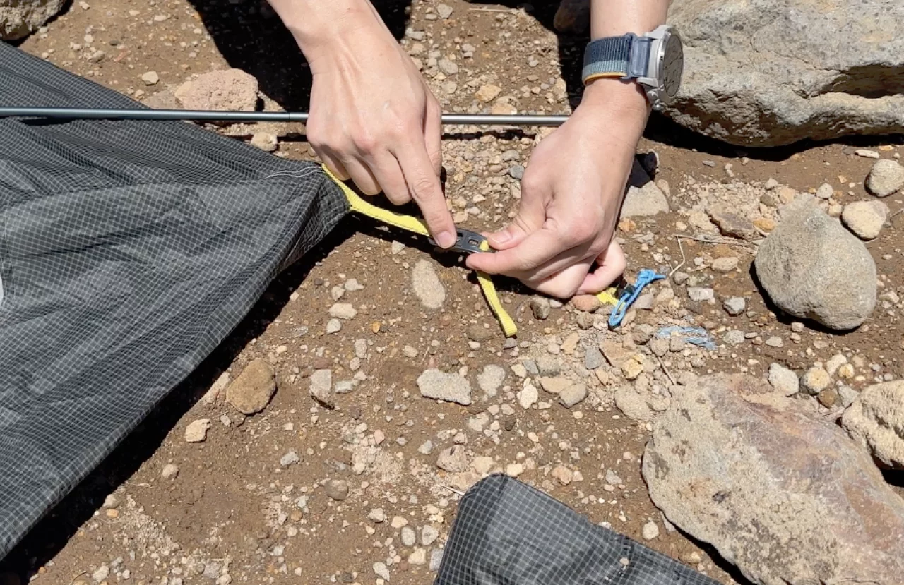 続いて吊り下げ式のデメリットは、スリーブ式がポールを本体に通して地面に固定する流れなのに対し、吊り下げ式は固定した後、タニ オズモ1Pの場合は13箇所ポールに本体を引っ掛ける必要があるため設営撤収に時間がかかります。またスリーブ式よりも吊り下げ式の方が居住空間、特にテント内部の天井空間が損なわれがちです。
