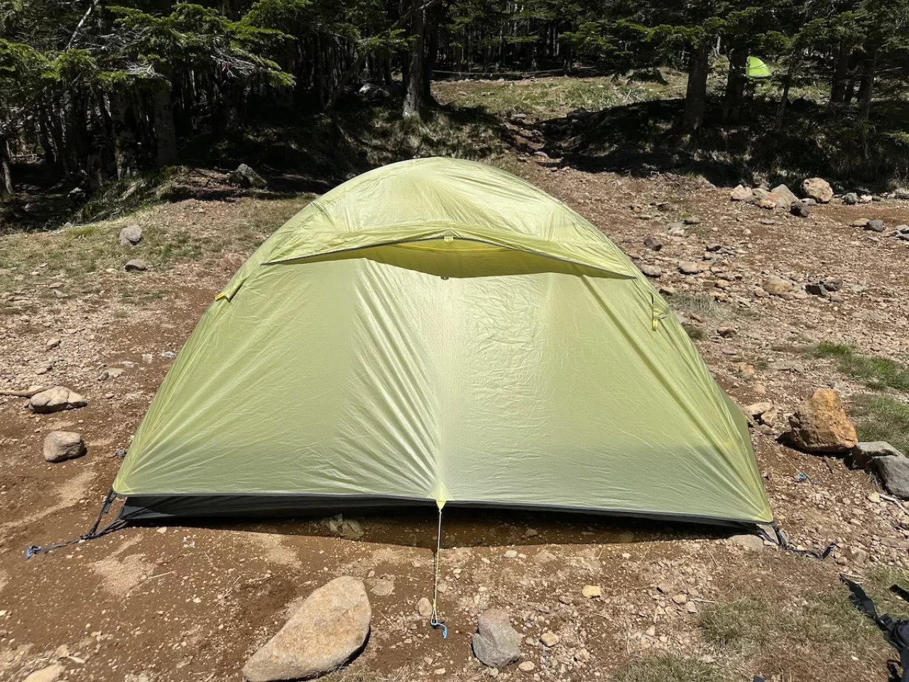 テントの出入り口は長辺に設けられており、前室面積が大きいので、例えば朝方や雨の日に前室を使って食事を準備するとき、ザックや登山靴が前室にあっても邪魔にならない良さがあります。